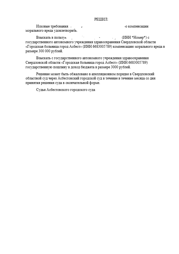 Суд взыскал с больницы в пользу Светланы Николаевны компенсацию морального вреда в размере 300.000 рублей.