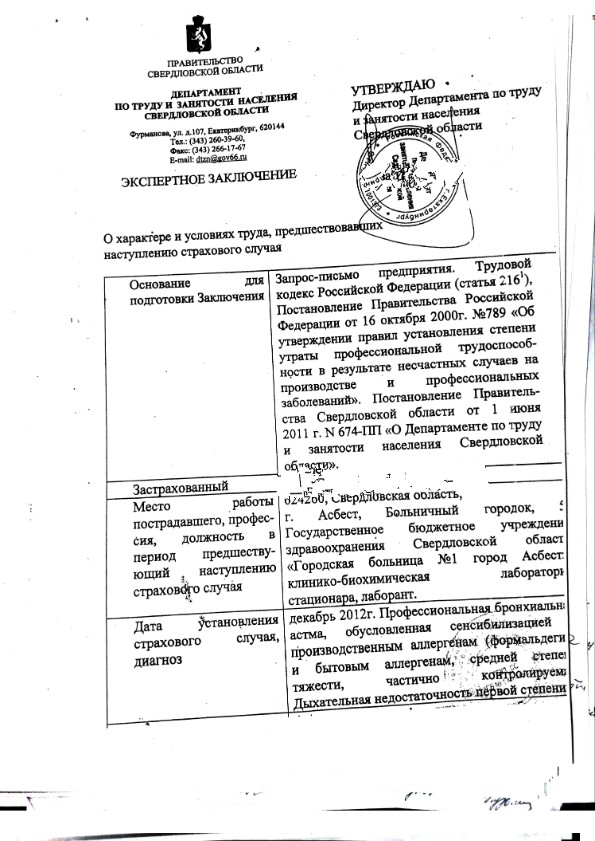 - Экспертное заключение Департамента по труду и занятости населения Свердловской области от 30.01.2013. Это официальный государственный документ, который подтверждает: условия труда Светланы Николаевны предшествовали наступлению страхового случая. Проще говоря — болезнь возникла именно из-за работы с формальдегидом.