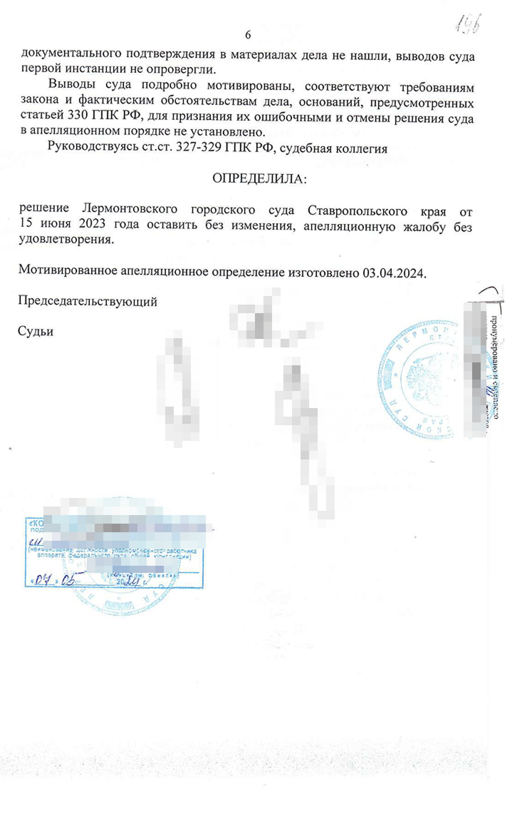 Заседание состоялось 3 апреля 2024 года. Мою жалобу отклонили и решение суда первой инстанции оставили без изменения.