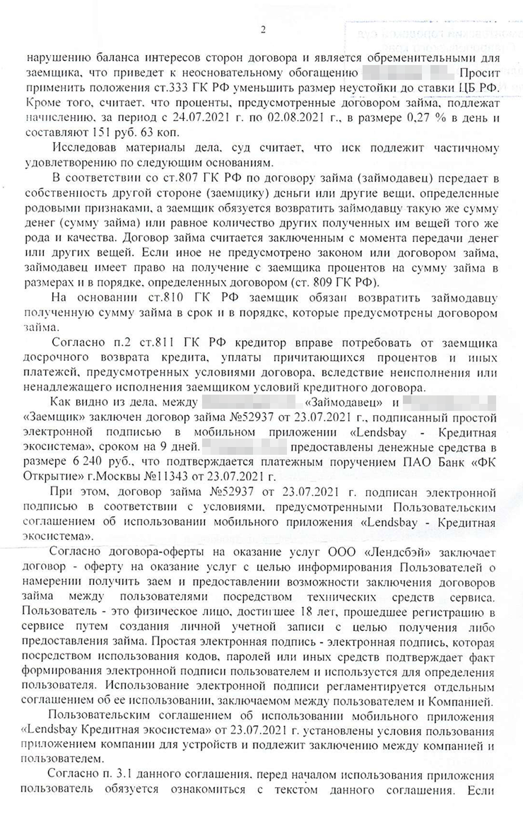 В 2021 году Сергей был студентом и нуждался в деньгах. Он обратился к предпринимателю Кириллу, чтобы взять в долг небольшую сумму. Тот в просьбе не отказал и передал 6 240 ₽ на десять дней по договору займа под 4% в день с неустойкой за невозврат 1% в день. Договор займа стороны заключили через интернет-платформу Lendsbay 23 июля.