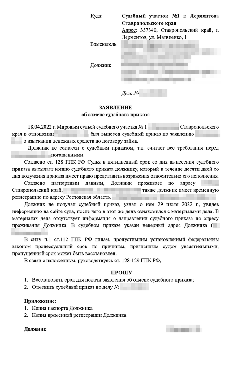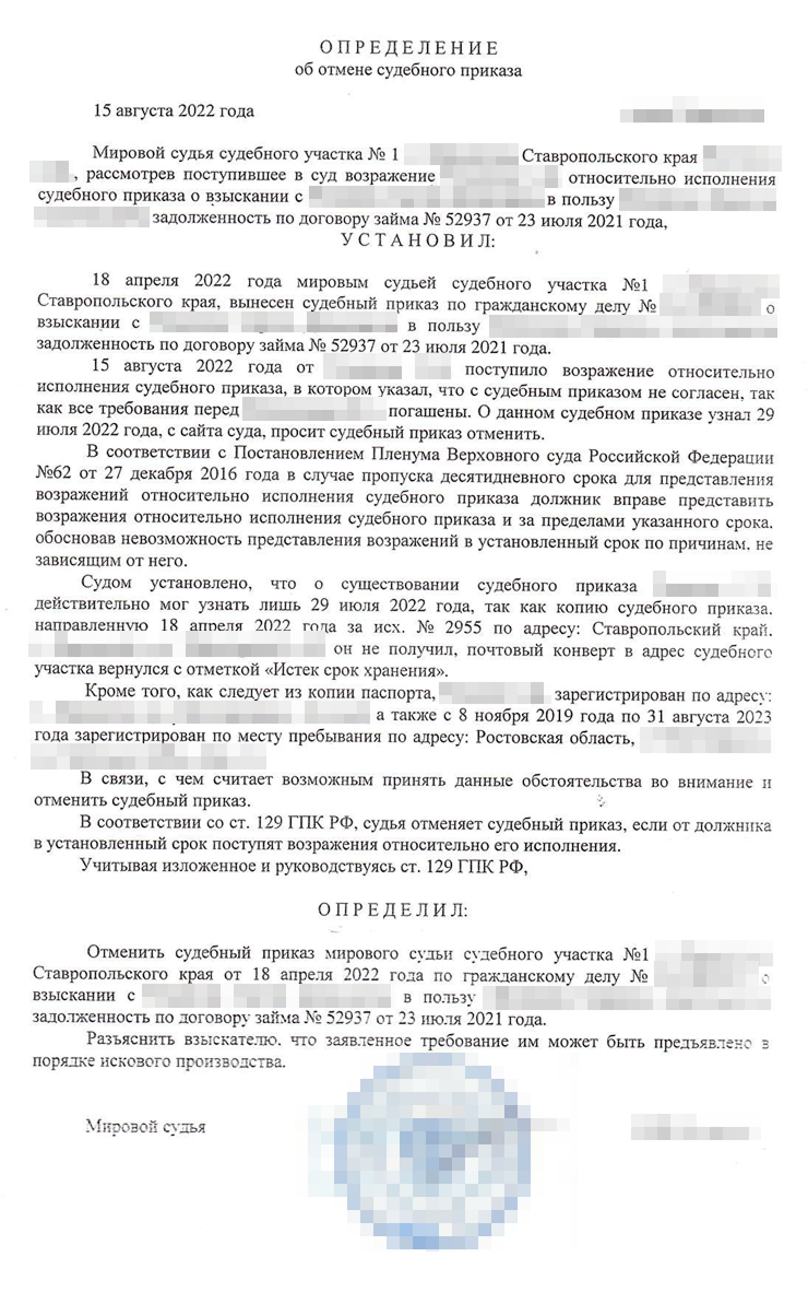 Я попросил его сходить к мировому судье и сфотографировать материалы дела. Так мы узнали, что судебный приказ из-за ошибки Кирилла отправили по неправильному адресу. Я подготовил возражение, где указал, что должника не уведомили как полагается, и отправил его мировому судье. Судебный приказ отменили 15 августа 2022 года. Сергей был рад, потому что решил, что платить долг не нужно.