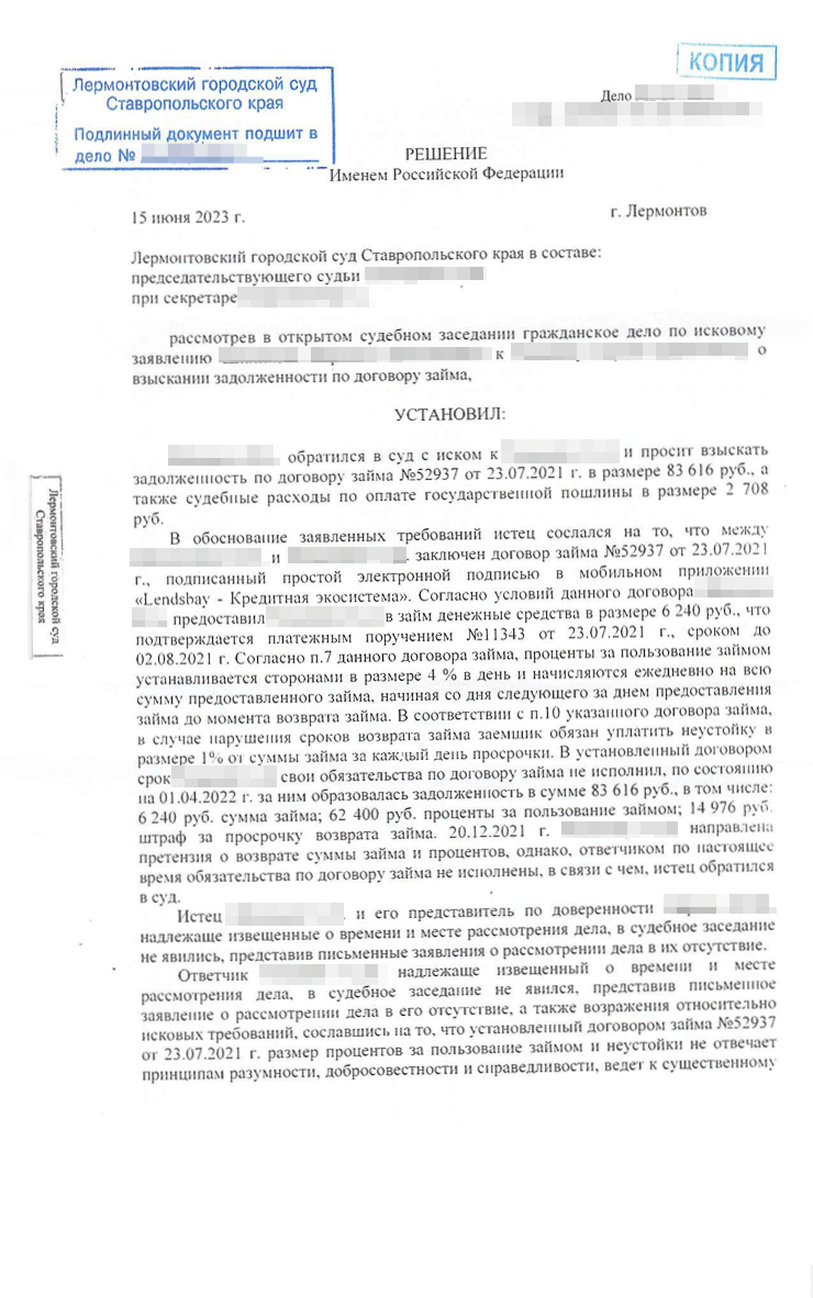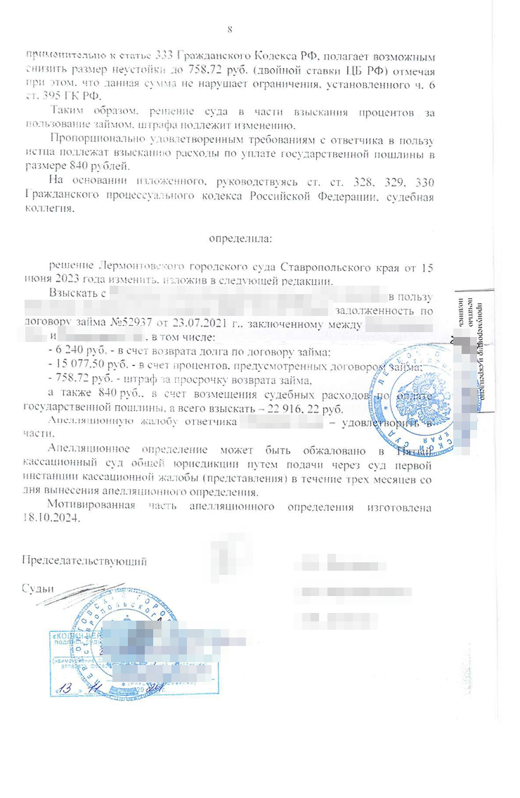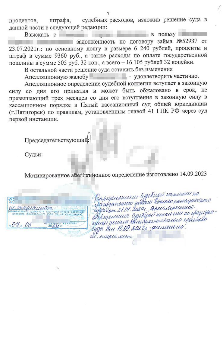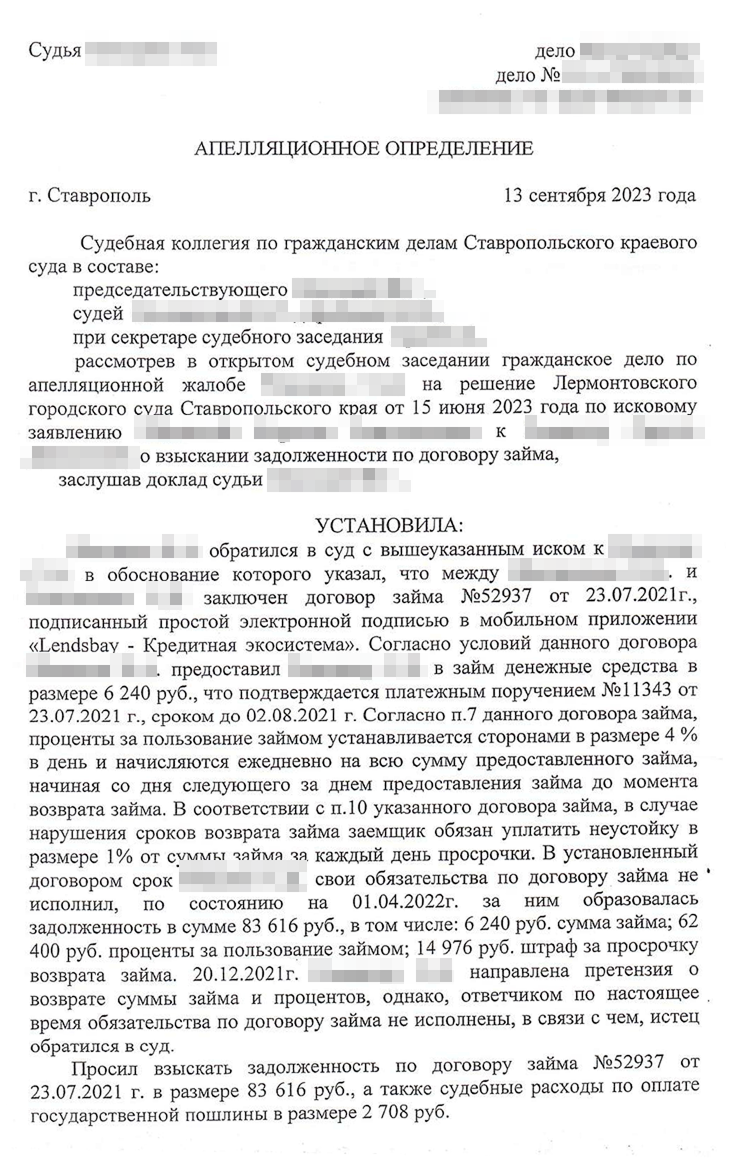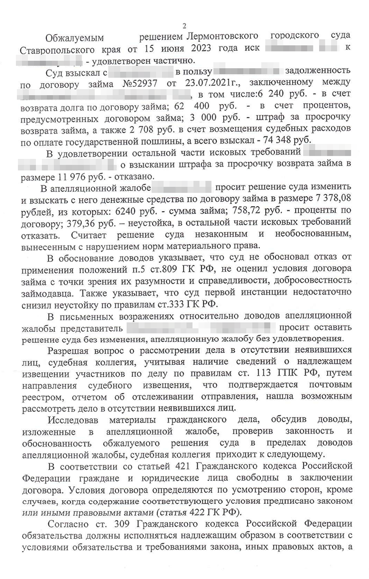 Дело рассмотрели 13 сентября 2023 года. Без нашего участия, так как в суде не было возможности использовать видео-конференц-связь, а мы решили не ехать на заседание в другой город. Коллегия также проигнорировала мои доводы о неадекватности процентов в договоре. Вместе с тем сумму снизили по другому неожиданному основанию.