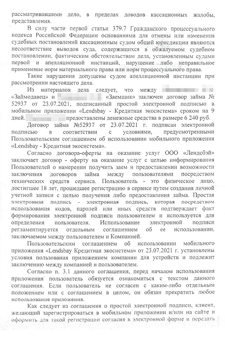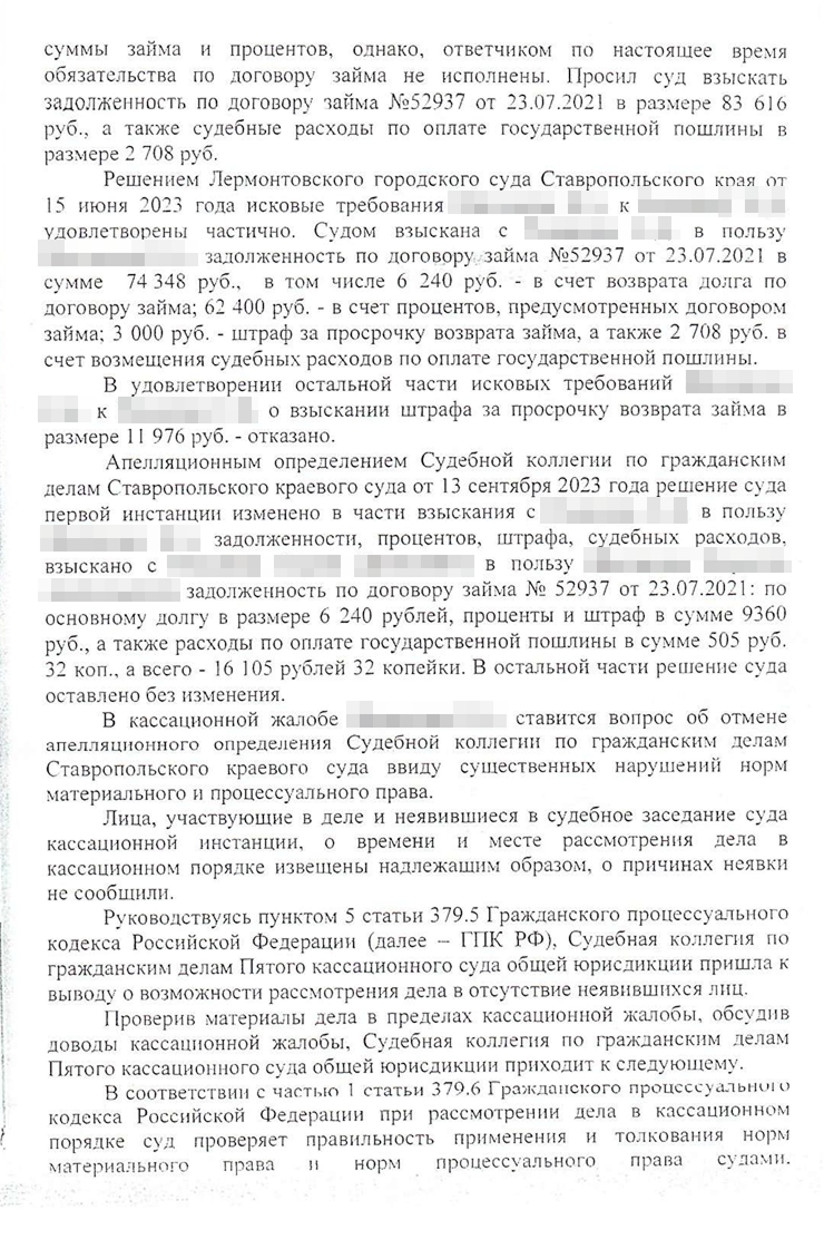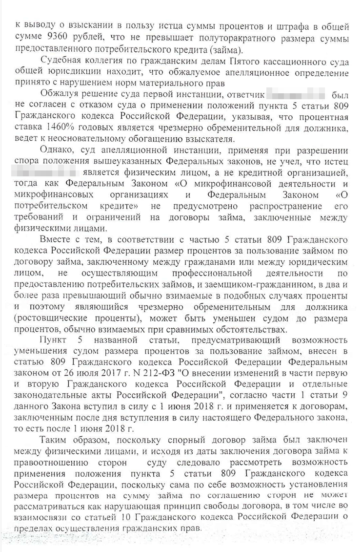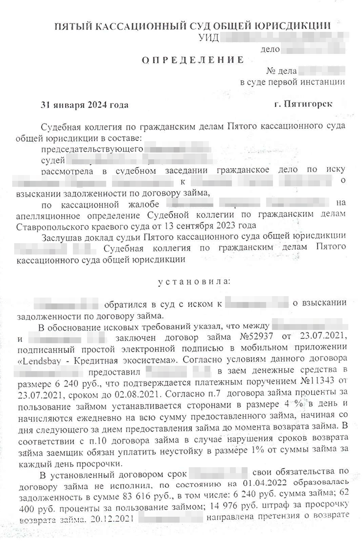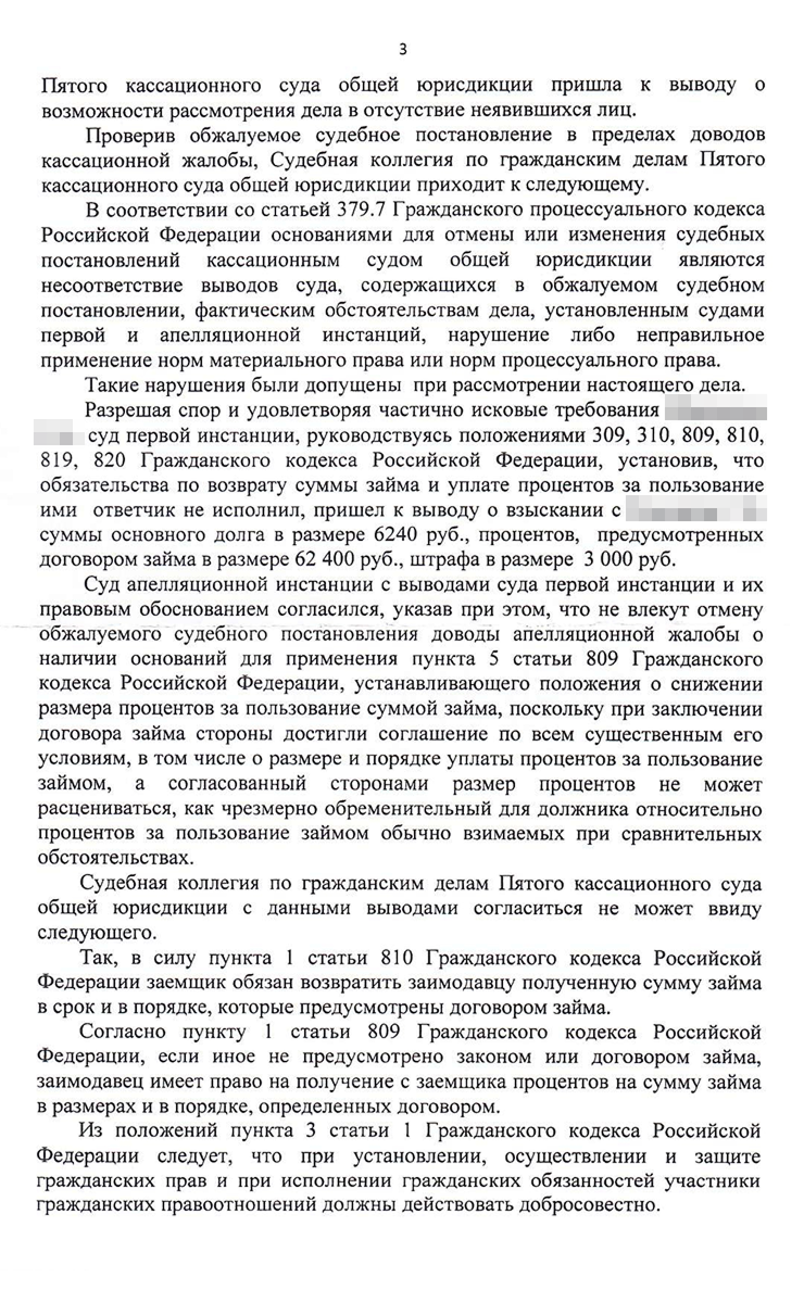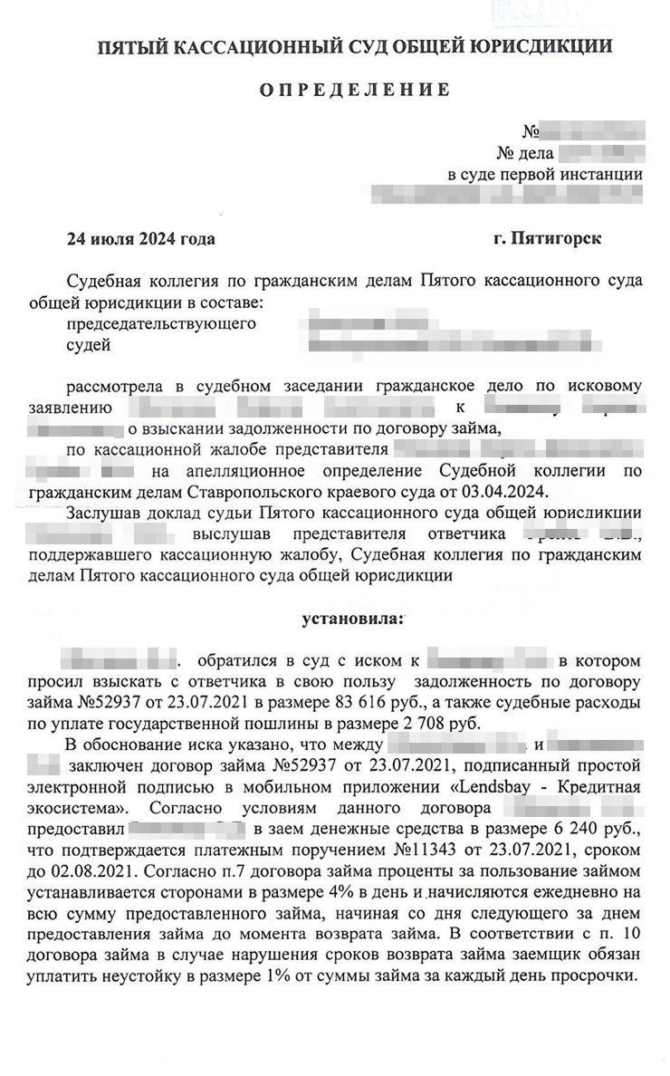Я оказался прав. Кирилл подал жалобу в Пятый кассационный суд общей юрисдикции. Вместе с юристом они рассуждали так же, как и я: закон об МФО нельзя применять к этому договору. Сергея неприятно удивило, что Кирилл не смирился с поражением. Клиент не захотел участвовать в процессе — мы не стали писать отзыв на кассационную жалобу и просто ждали решения.