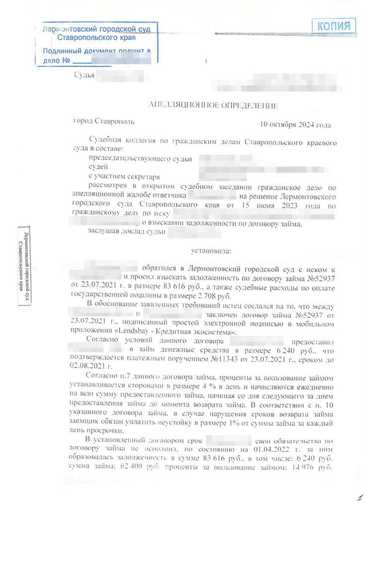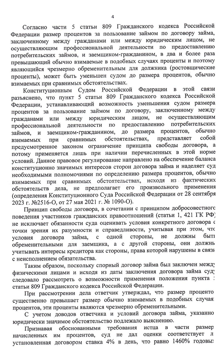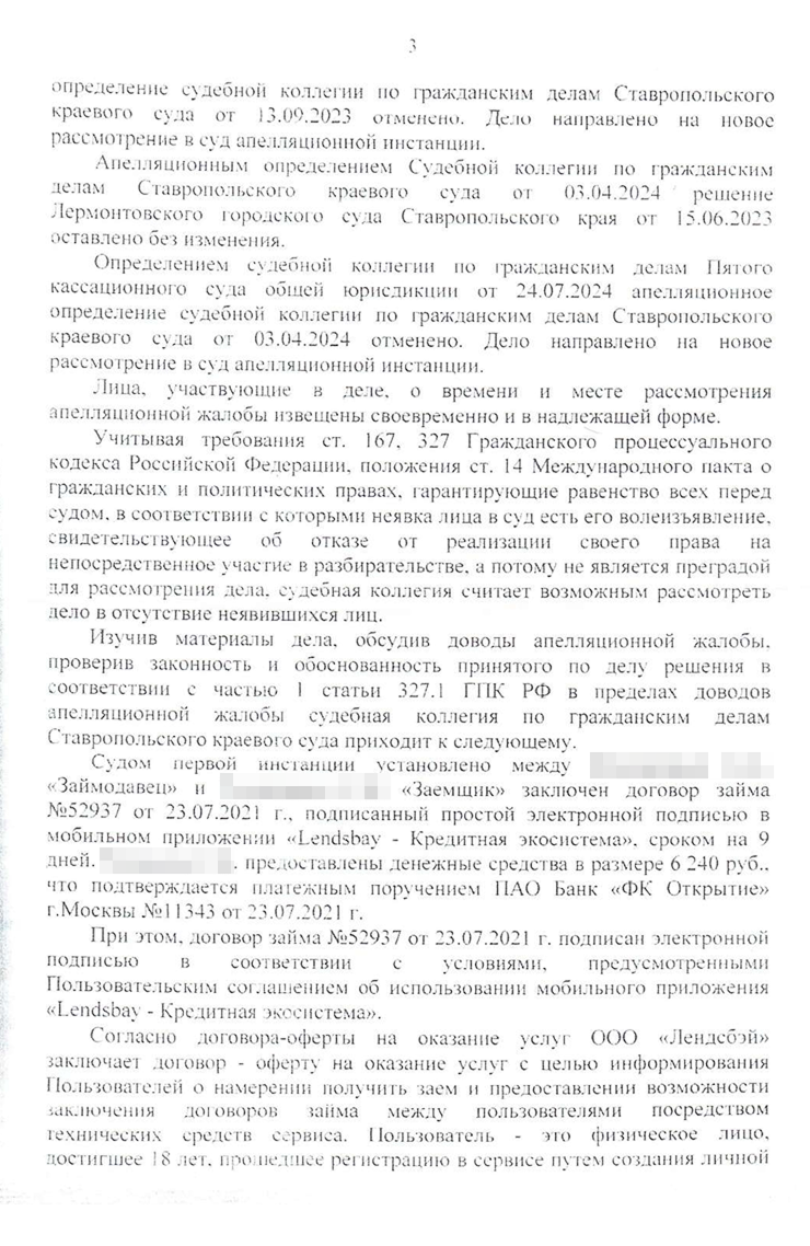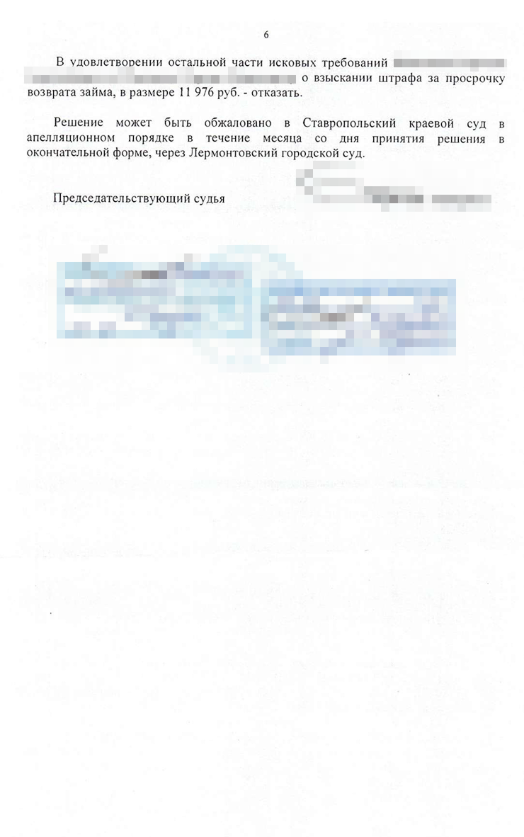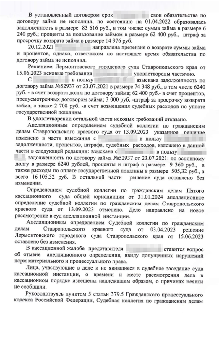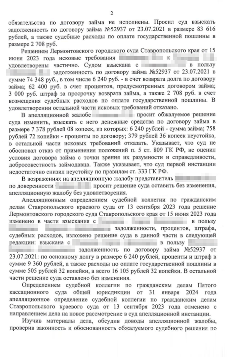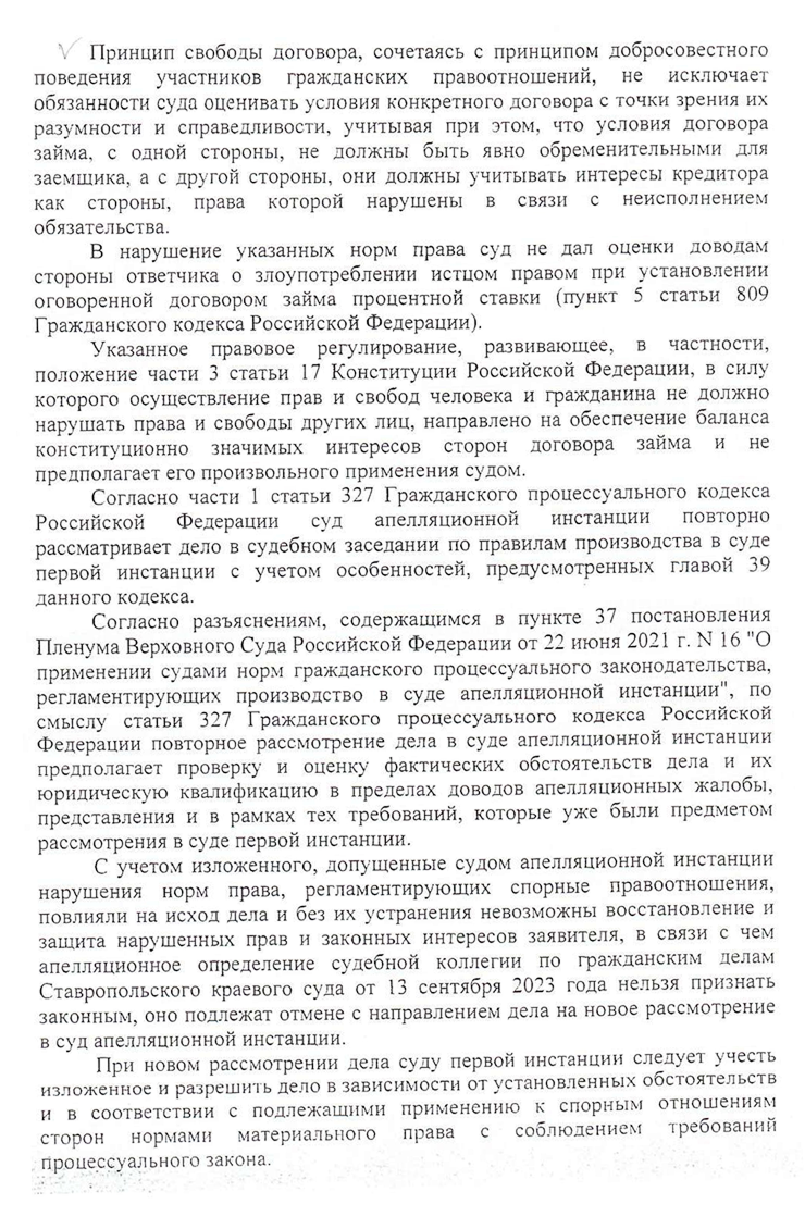 Дело вновь вернулось в Ставропольский краевой суд. Я был уверен, что сумму долга снизят. Кассация обязала апелляцию установить обычно взимаемые проценты по договору займа. От этого уклонился суд первой и второй инстанции. Очевидно, что 1 460% годовых плюс 365% неустойки — не рыночные ставки.