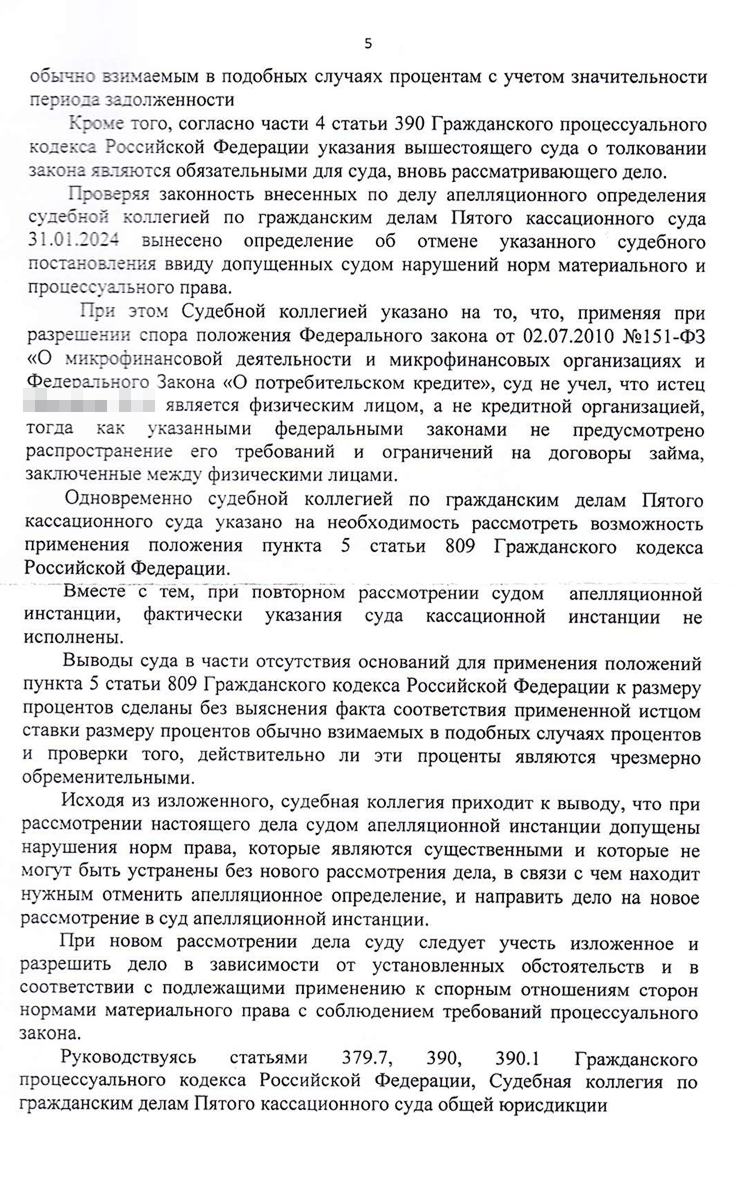 В определении суд указал, что в апелляции не оценили мой довод о завышенных процентах. Поэтому при новом рассмотрении он должен определить их рыночный размер и сравнить их с условиями договора займа. После этого уже решить, можно ли их снизить.