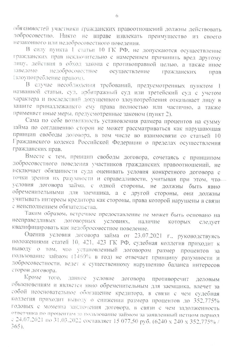 Судьи не согласились с моим доводом о том, что снизить проценты нужно до двойной ключевой ставки. Они решили, что это перекос в сторону ответчика. Вместе с тем они сверились со среднерыночной полной стоимостью потребительских кредитов на срок до 30 дней на сумму до 30 000 ₽ и снизили проценты с 1 460% годовых до 352,775%.