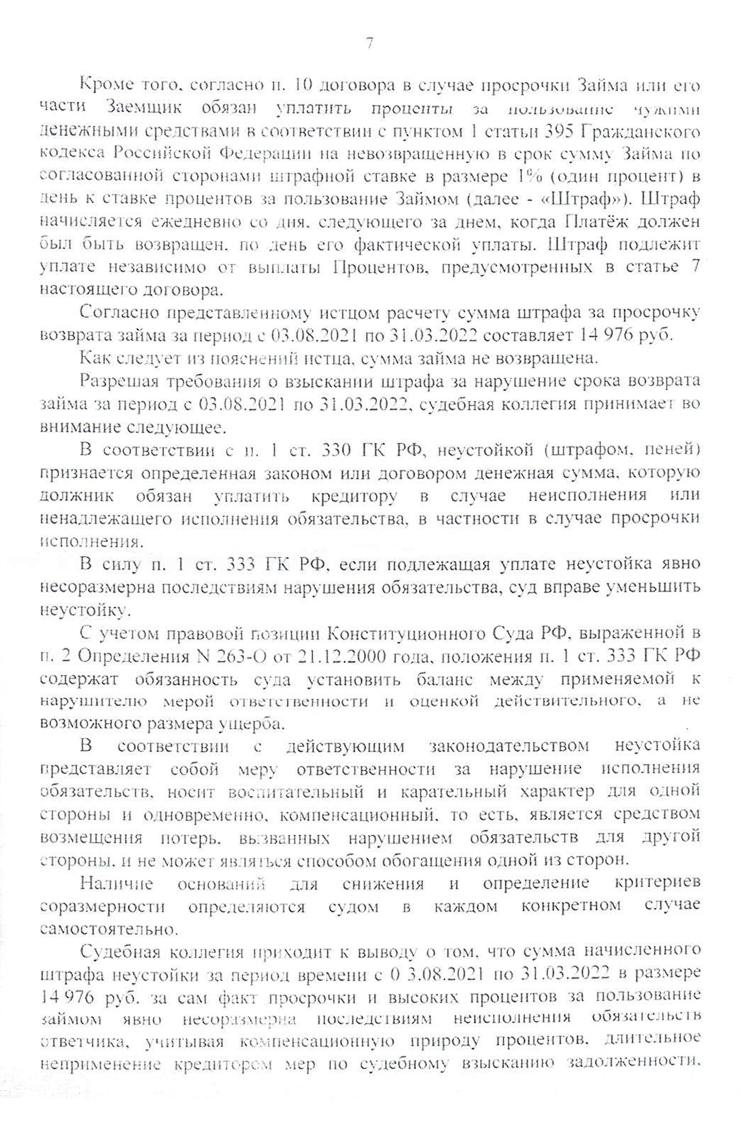В жалобе я указал, что завышение процентов в договоре займа относительно рыночного уровня — основание для их снижения. Довод суда первой инстанции о тяжелых жизненных обстоятельствах на момент получения денег некорректный, потому что в законе такого требования нет. Также я написал, что суд снизил неустойку недостаточно. Ведь 3 000 ₽ — это почти половина от суммы займа, а истец заявляет к взысканию период менее года.