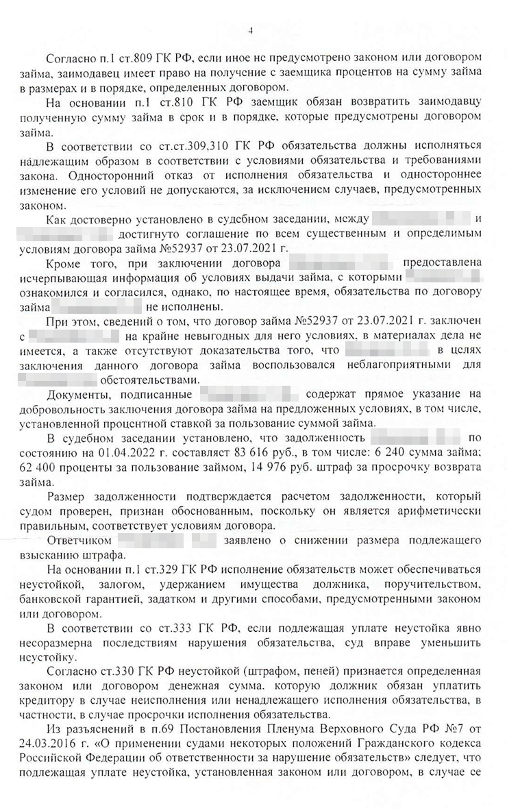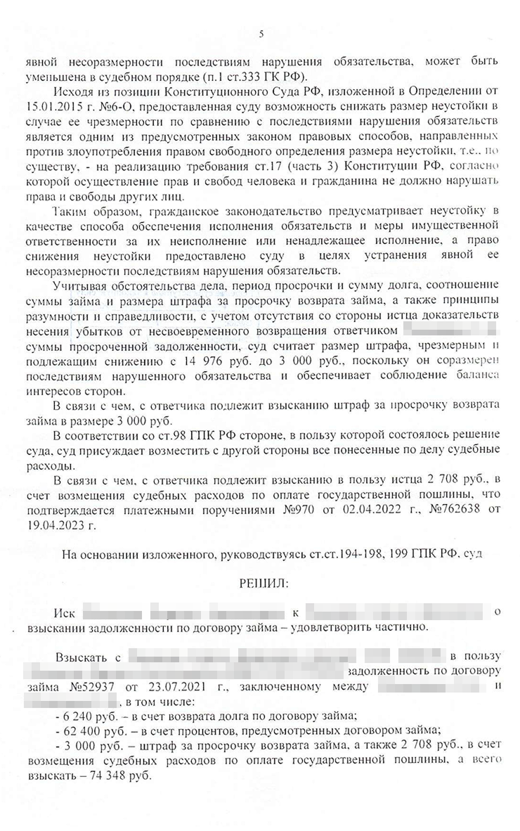 Мы стали ждать рассмотрения дела. 15 июня 2023 года суд вынес решение. Судью не убедили мои доводы о неадекватности процентов в договоре, и она взыскала все, кроме неустойки. Ее она снизила с 14 976 до 3 000 ₽. Всего мой клиент должен был заплатить 74 348 ₽.