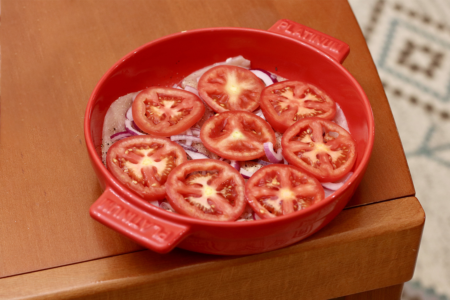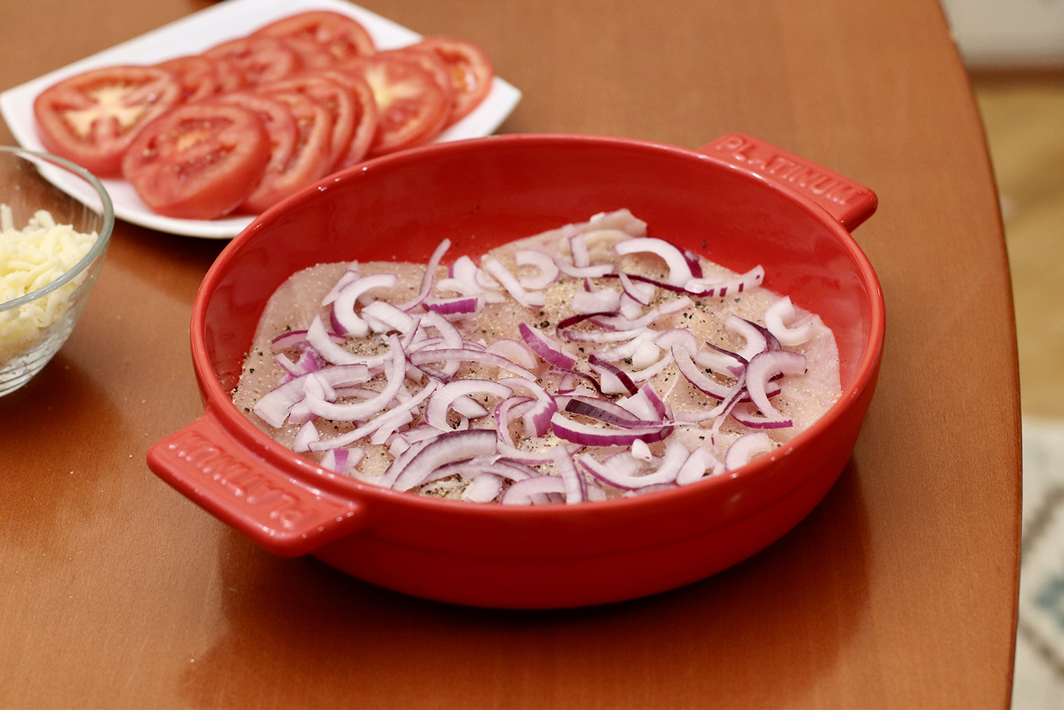 Шаг 5. Форму смажьте маслом. Выложите в нее курицу, сверху — лук, затем помидоры. Поперчите и посолите.
