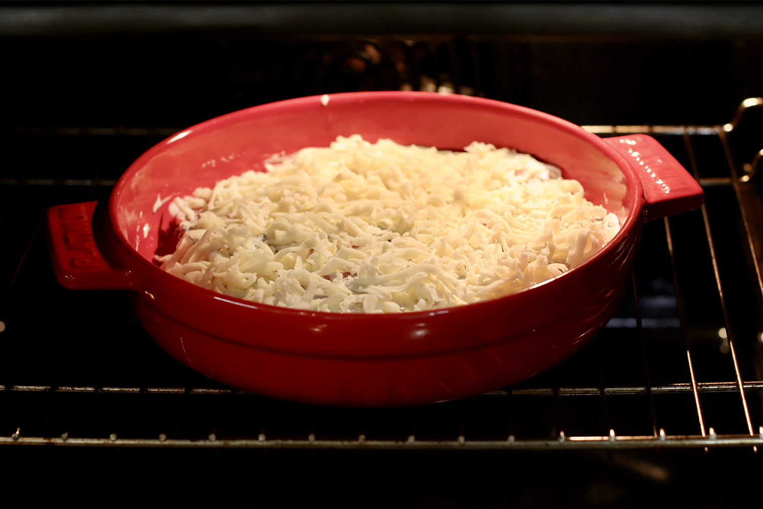 Шаг 6. Сметанный соус влейте в форму поверх курицы и помидоров. Посыпьте тертым сыром.