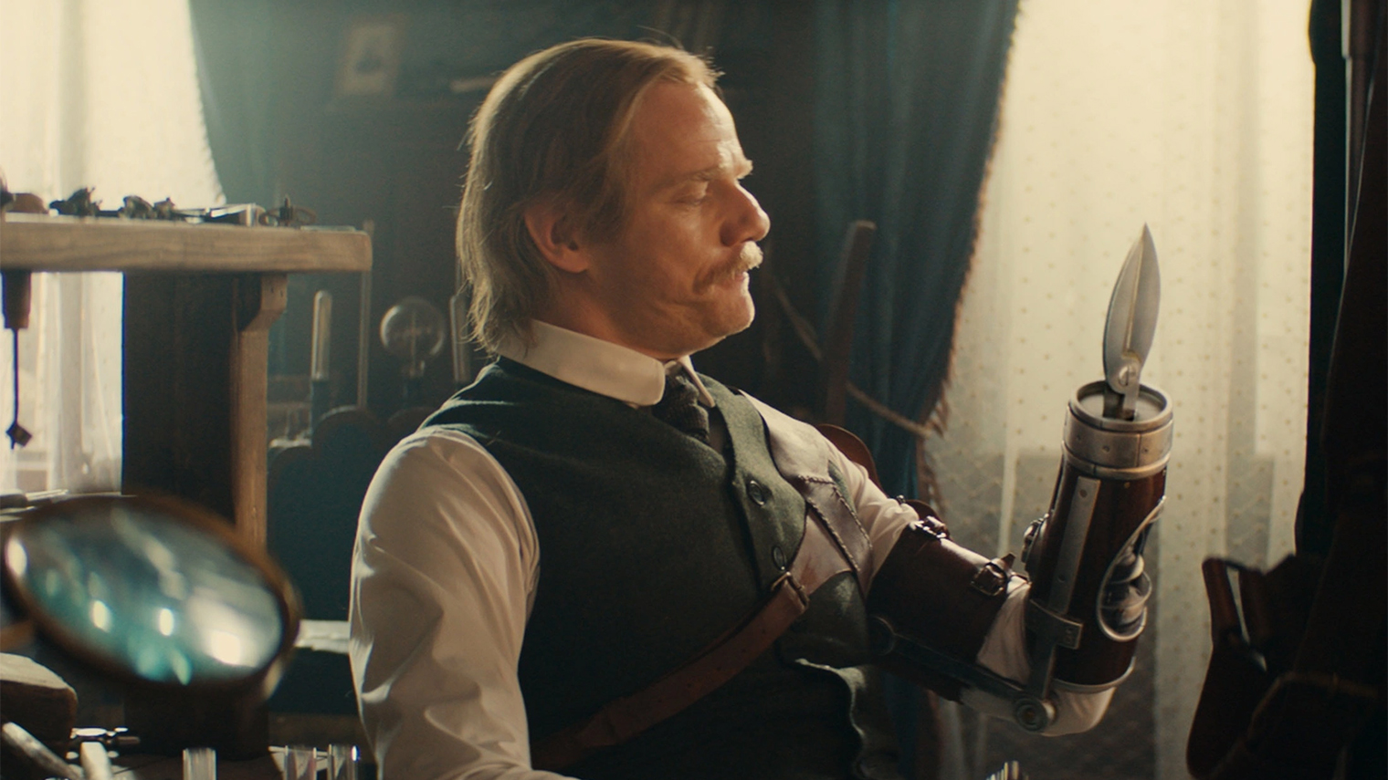 Левша постоянно мастерит и использует чудные устройства: от говорливого робота-собутыльника до «перочинной» руки, которая выдвигает нужную насадку на обрубке кисти. Герой Колокольникова собирает из подручных предметов детектор механических блох и электрические бомбы. Словом, талант персонажа позволяет неожиданным образом решать навалившиеся на плечи проблемы. Да и смотрятся изобретения по-хорошему забавно: они громоздкие, мультяшные и милые.