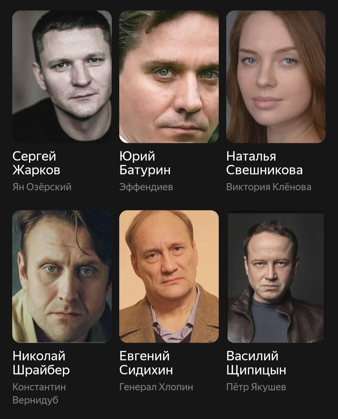 Николай Шрайбер, он же подполковник Константин Вернидуб, просто великолепно исполнил свою роль одного из сотрудников отдела Яна Озерского. Создаётся даже такое впечатление что он сам себя и играл. Проявил он себя по сути в седьмом эпизоде. Хотя нельзя сказать что он исполнил свою роль на пять, но уж точно не хуже обычного.