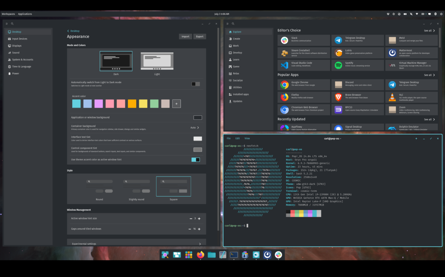 🌌 COSMIC. Новейшая вариация оболочки для Linux. Совмещает эстетическую сторону GNOME с простотой KDE Plasma. Пока работает нестабильно и еще не вышла в релиз.