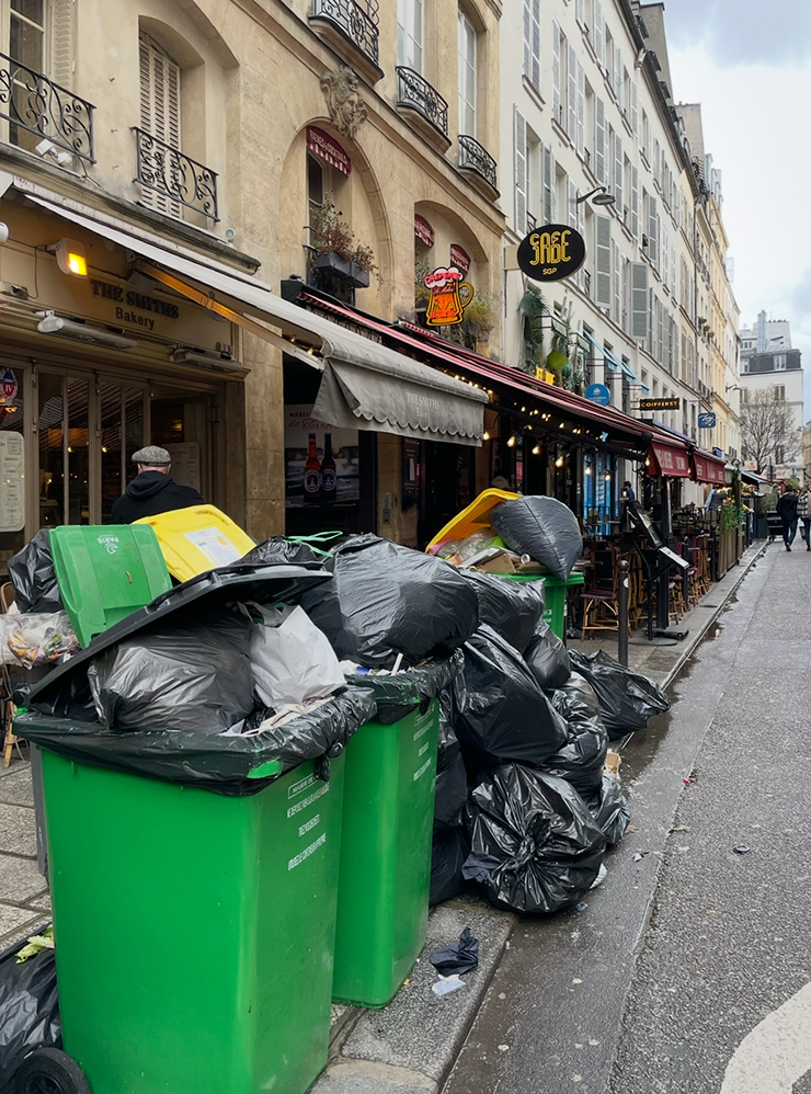 Забастовка мусорщиков в марте 2023 года. Тогда Париж буквально утонул в горах мусора: улицы столицы завалило десятью тысячами тонн отходов. Причина — все та же пенсионная реформа Макрона, из-за которой повысили возраст выхода на пенсию. Сотрудники коммунальных служб, в первую очередь мусорщики и работники мусоросжигательных заводов, вышли на бессрочную стачку. К ним присоединились транспортники, энергетики, нефтепереработчики. Париж оказался символом кризиса: туристические районы, включая Латинский квартал и Эйфелеву башню, завалило мешками с мусором.