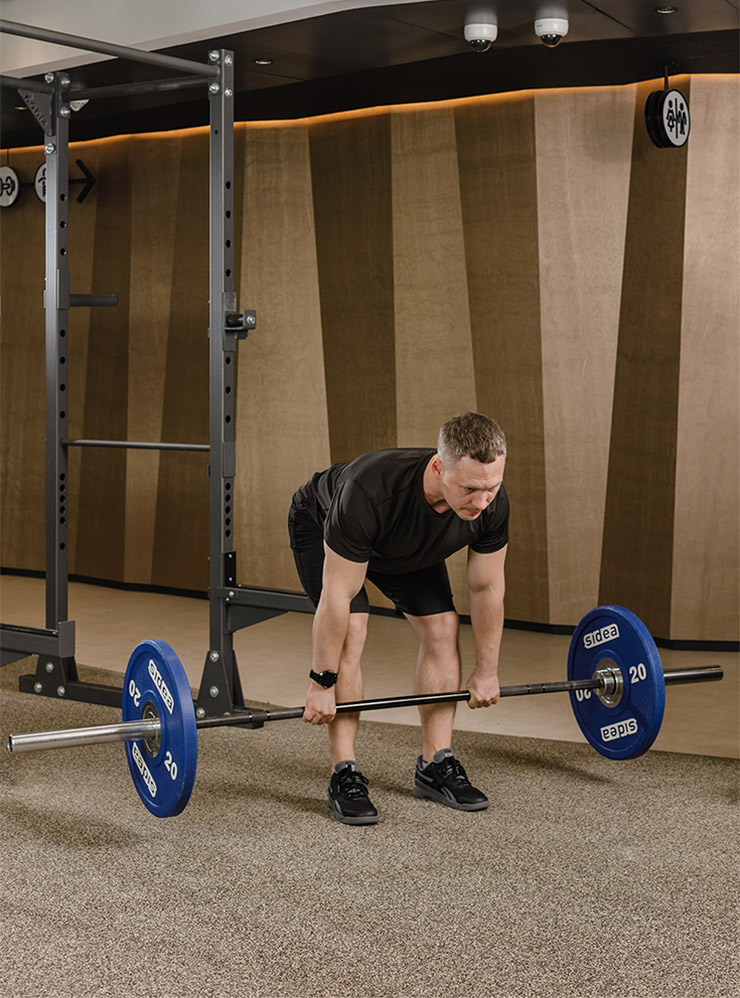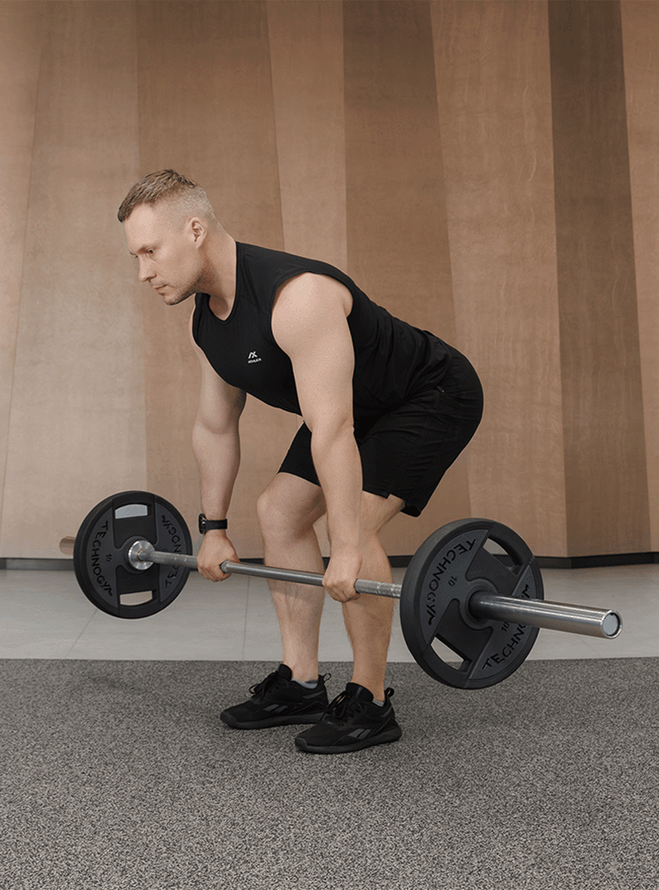 - Положите штангу на пол, подойдите к ней и расположите ноги на ширине таза. Отведите таз назад и наклоните корпус. Когда плечи будут над грифом, возьмитесь за него закрытым хватом чуть шире плеч. Сохраняйте ровное положение позвоночника.