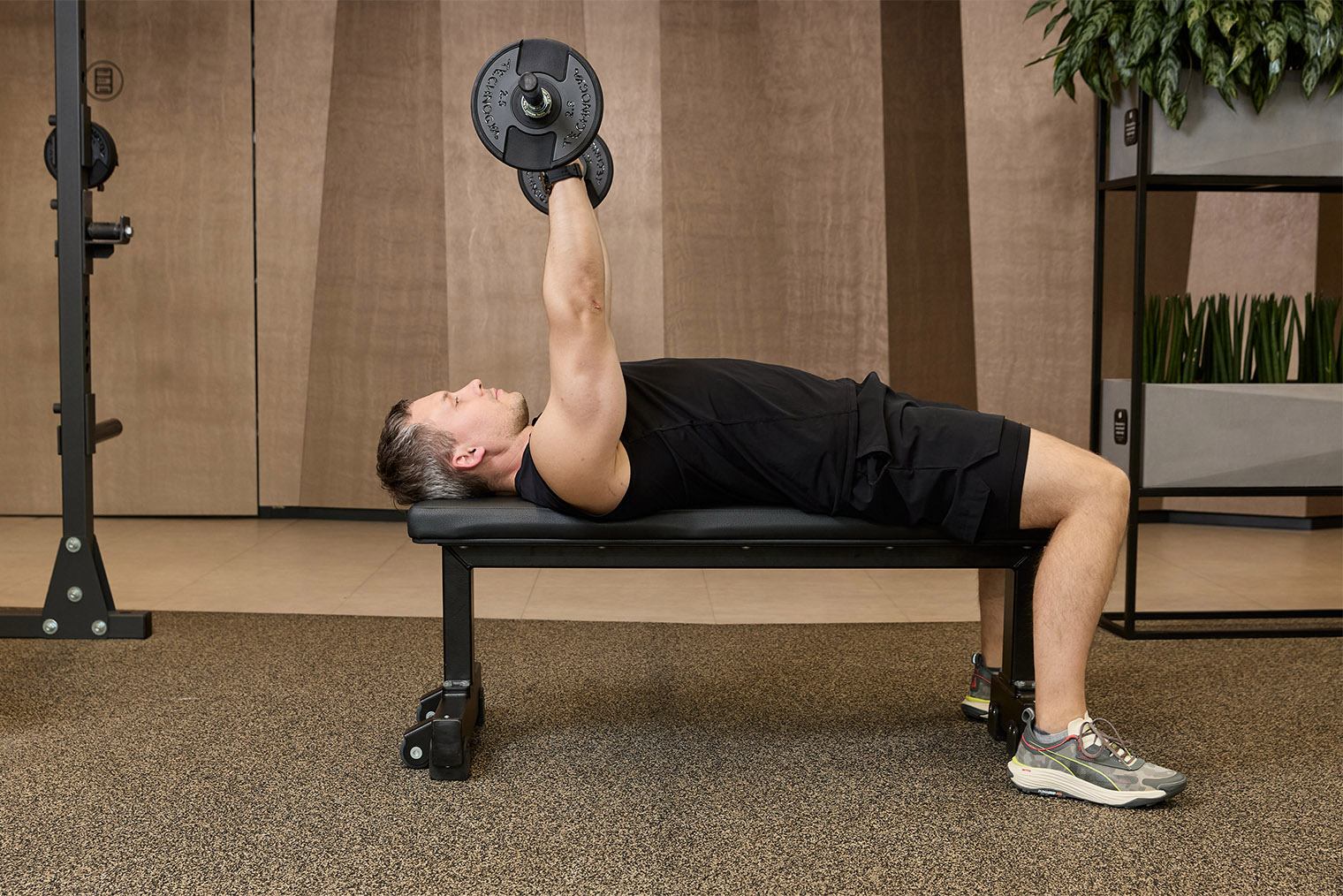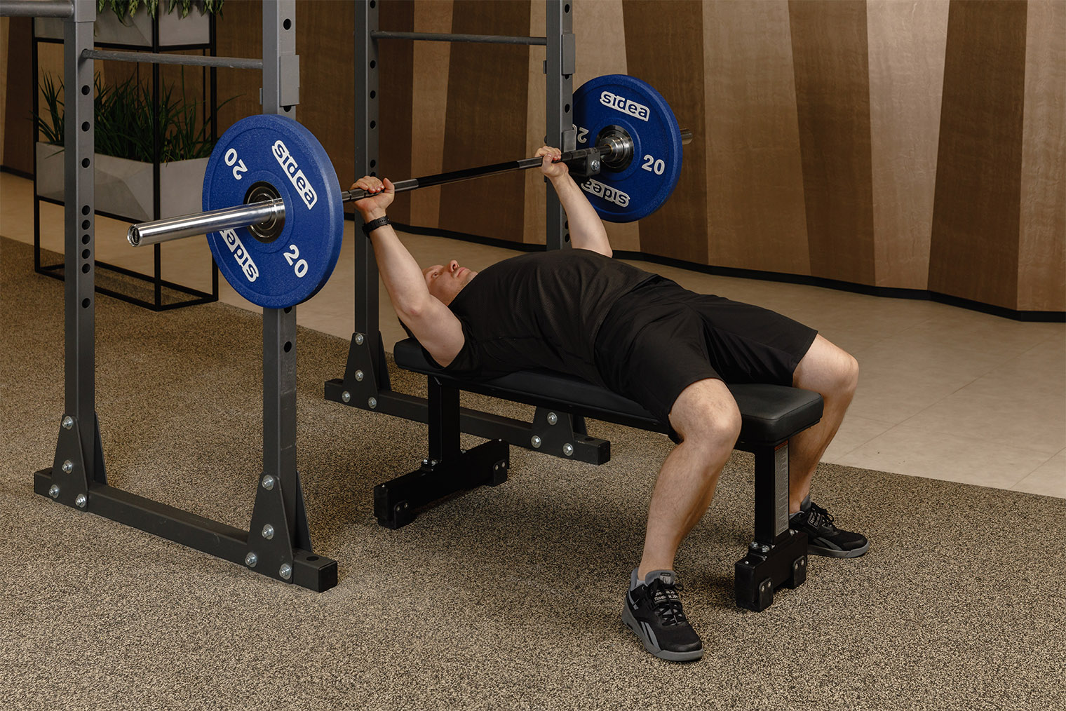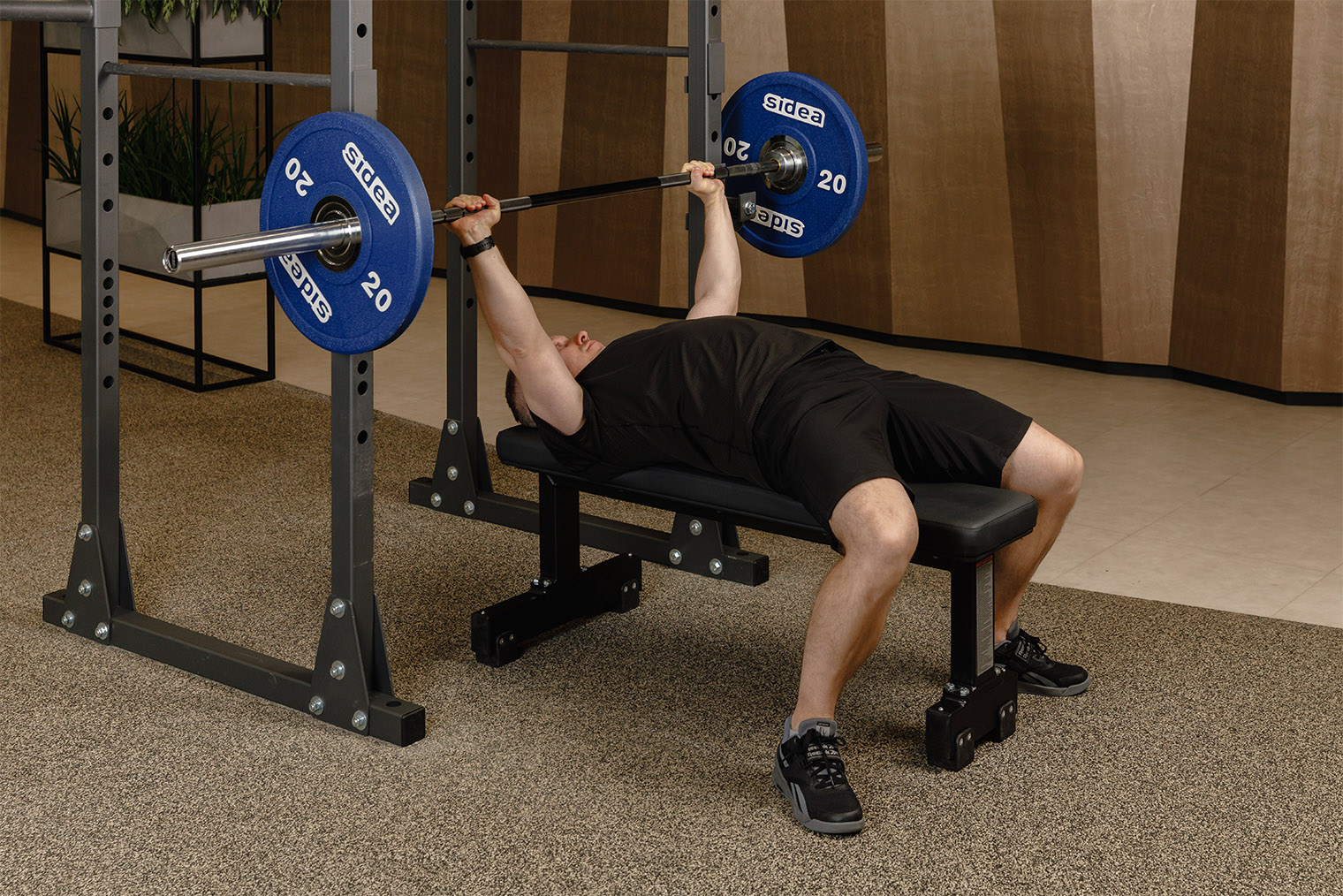 - Лягте на скамью так, чтобы штанга располагалась над глазами. Расставьте ноги чуть шире плеч и плотно прижмите стопы к полу. Сведите и опустите лопатки, сохраняйте естественный прогиб в пояснице. Возьмите гриф широким закрытым хватом, снимите штангу со стоек и расположите ее над плечевыми суставами.