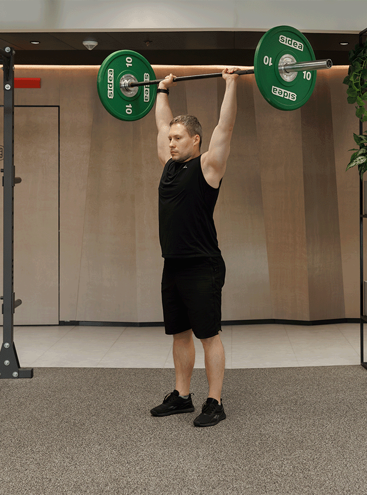 - На выдохе выпрямите руки и вытолкните штангу вверх. Следите, чтобы ладони смотрели вперед, а позвоночник оставался неподвижным — не прогибайтесь в пояснице.