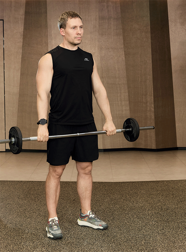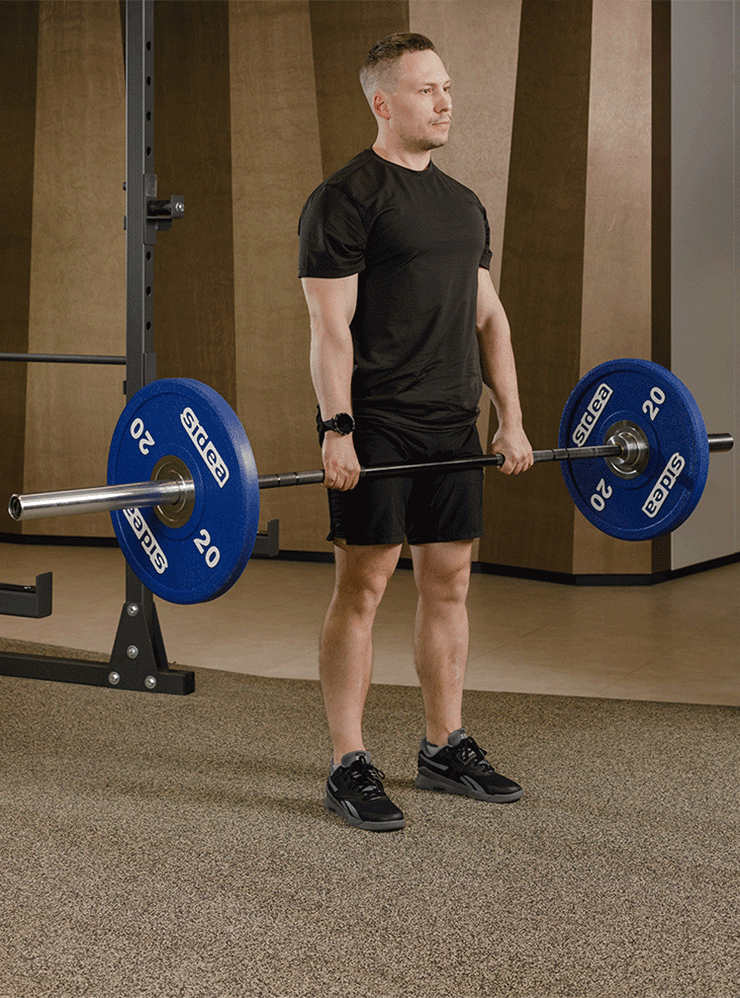 - Расположите штангу на стойках перед собой. Встаньте прямо, расположите ноги на ширине плеч. Возьмите штангу обратным хватом на ширине плеч и опустите ее к бедрам, сведите и опустите лопатки.