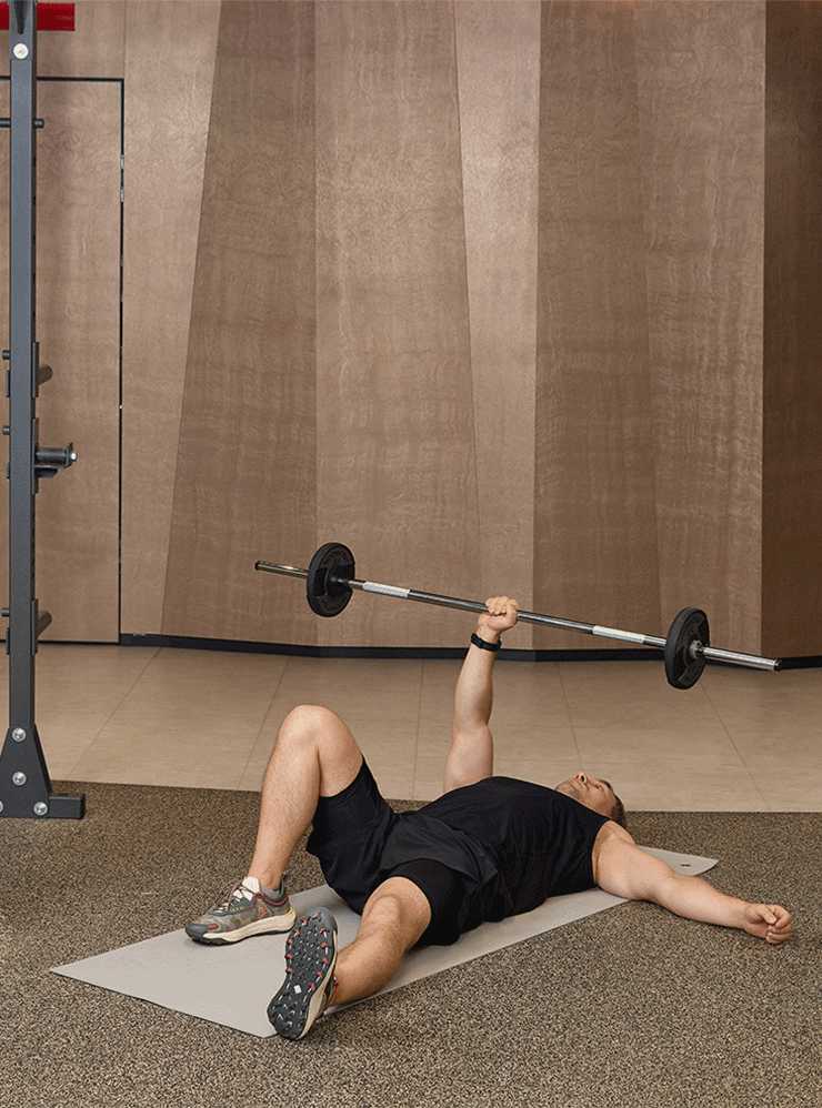 - Возьмитесь за середину грифа правой рукой, лягте на спину и выпрямите левую ногу, правую согните в колене и поставьте на пол. Вытяните и зафиксируйте руку со снарядом над плечевым суставом, свободную руку расположите вдоль тела или немного в стороне.