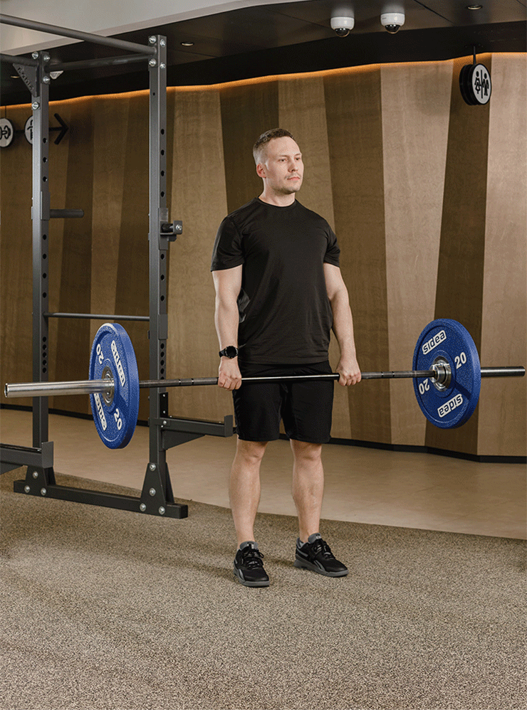 - Расположите штангу на стойках перед собой на уровне таза. Возьмитесь за гриф прямым закрытым хватом чуть шире плеч и снимите штангу со стоек. Шагните назад, встаньте ровно и расположите ноги на ширине плеч.