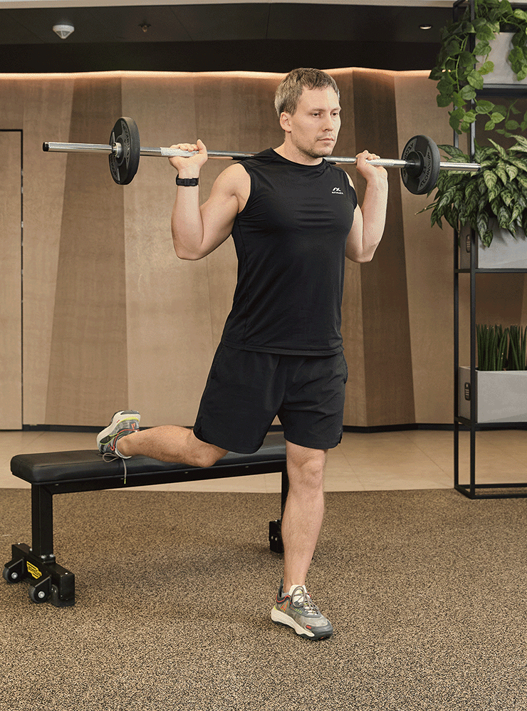 - Расположите штангу на стойках на уровне груди. Подсядьте под штангу, возьмитесь за гриф закрытым хватом чуть шире плеч и расположите его на плечах так, чтобы он не касался позвоночника. Сведите и опустите лопатки, зафиксируйте спину ровно. Встаньте, снимите штангу со стоек и шагните назад. Положите правую ногу на опору сзади.