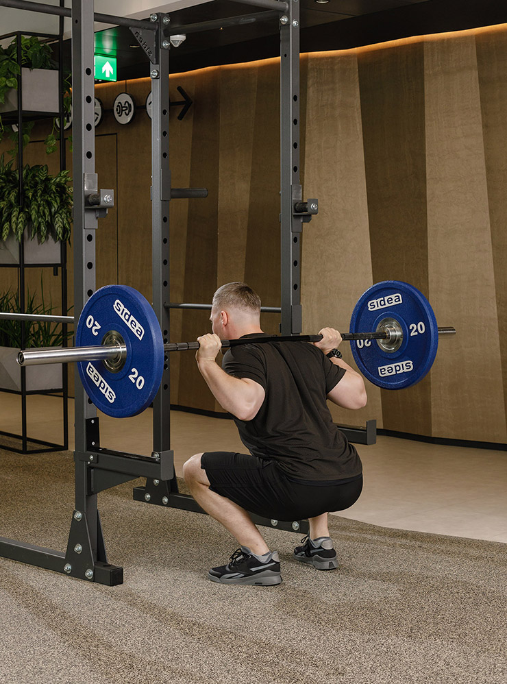 - Расположите штангу на стойках на уровне груди. Подсядьте под штангу, возьмитесь за гриф закрытым хватом чуть шире плеч и расположите его на плечах так, чтобы он не касался позвоночника. Сведите и опустите лопатки, зафиксируйте спину ровно. Встаньте, снимите штангу со стоек и шагните назад. Поставьте ноги на ширине плеч и немного разверните стопы в стороны.