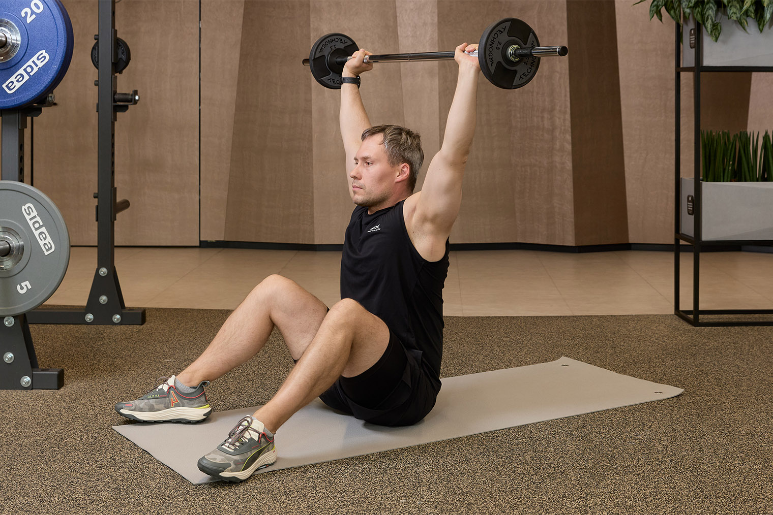 В работу включаются все мышцы живота, а использование штанги создает дополнительную нагрузку для мышц рук.