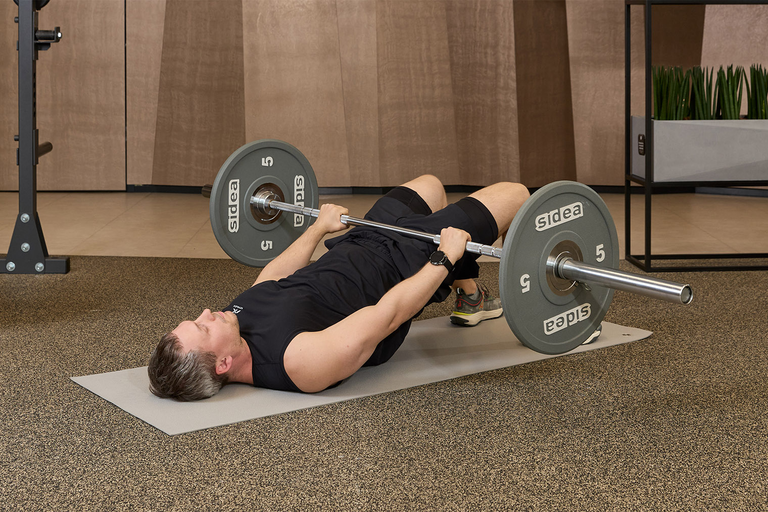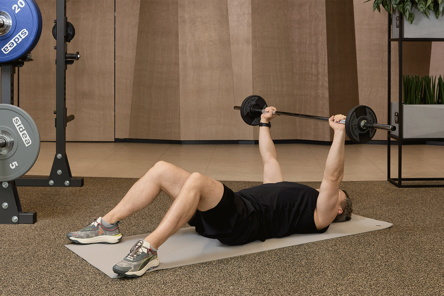 - Лягте на пол или скамью. Согните ноги в коленях и поставьте стопы на опору. Расположите штангу на вытянутых руках на уровне плечевых суставов, удерживая ее закрытым хватом.