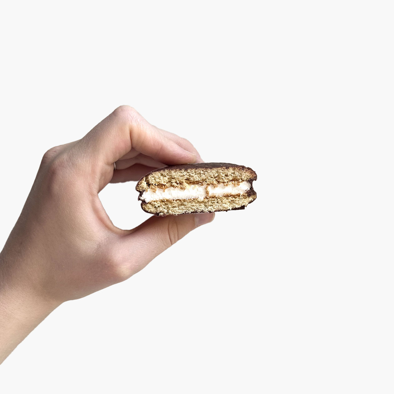 Классика вне времени. Именно этот десерт представляю, когда слышу «чокопай». В нем идеально все: тонкая шоколадная глазурь, два слоя бисквита и зефир в середине.