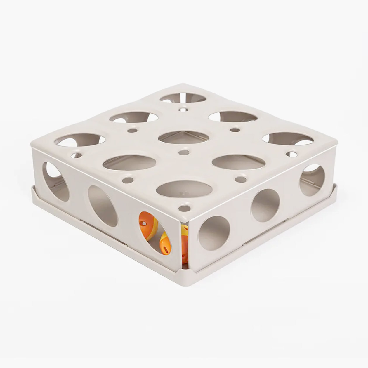 Такую игру можно совмещать с кормлением животного — если котик уже сытый, взаимодействовать с игрушкой он будет неохотно. Знакомство с игрушкой уместно начинать с вручения вкусняшки — разбросайте кусочки корма по доске и позвольте кошке съесть их без игры. Далее усложните задачу: закройте лакомства колпачками, позовите питомца, снимите колпачки и покажите, что под ними угощение. Через пару тренировок положите лакомства под колпачки на глазах у питомца, но сами их не снимайте — дождитесь, когда это сделает кошка.