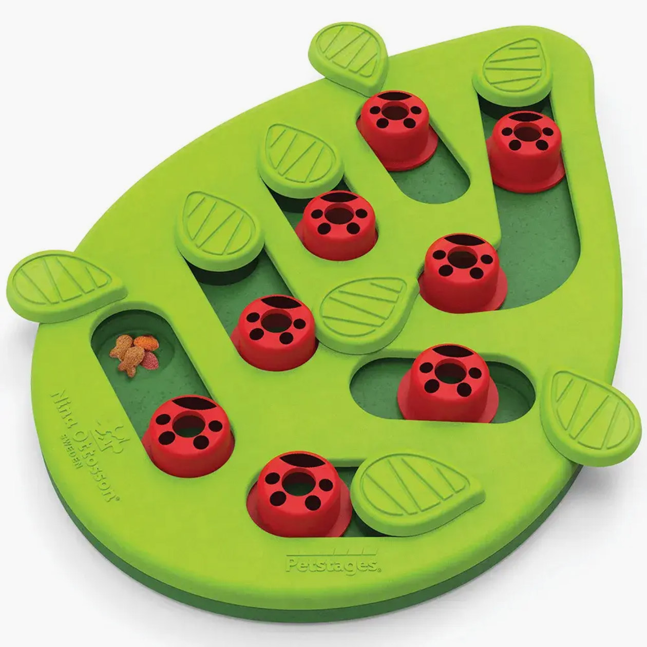 Развивающие игрушки предлагают кошке решить задачу и получить награду — угощение. Например, на доске раскладывают лакомства и закрывают их маленькими колпачками. Кошка должна опрокинуть колпачки и съесть угощение.