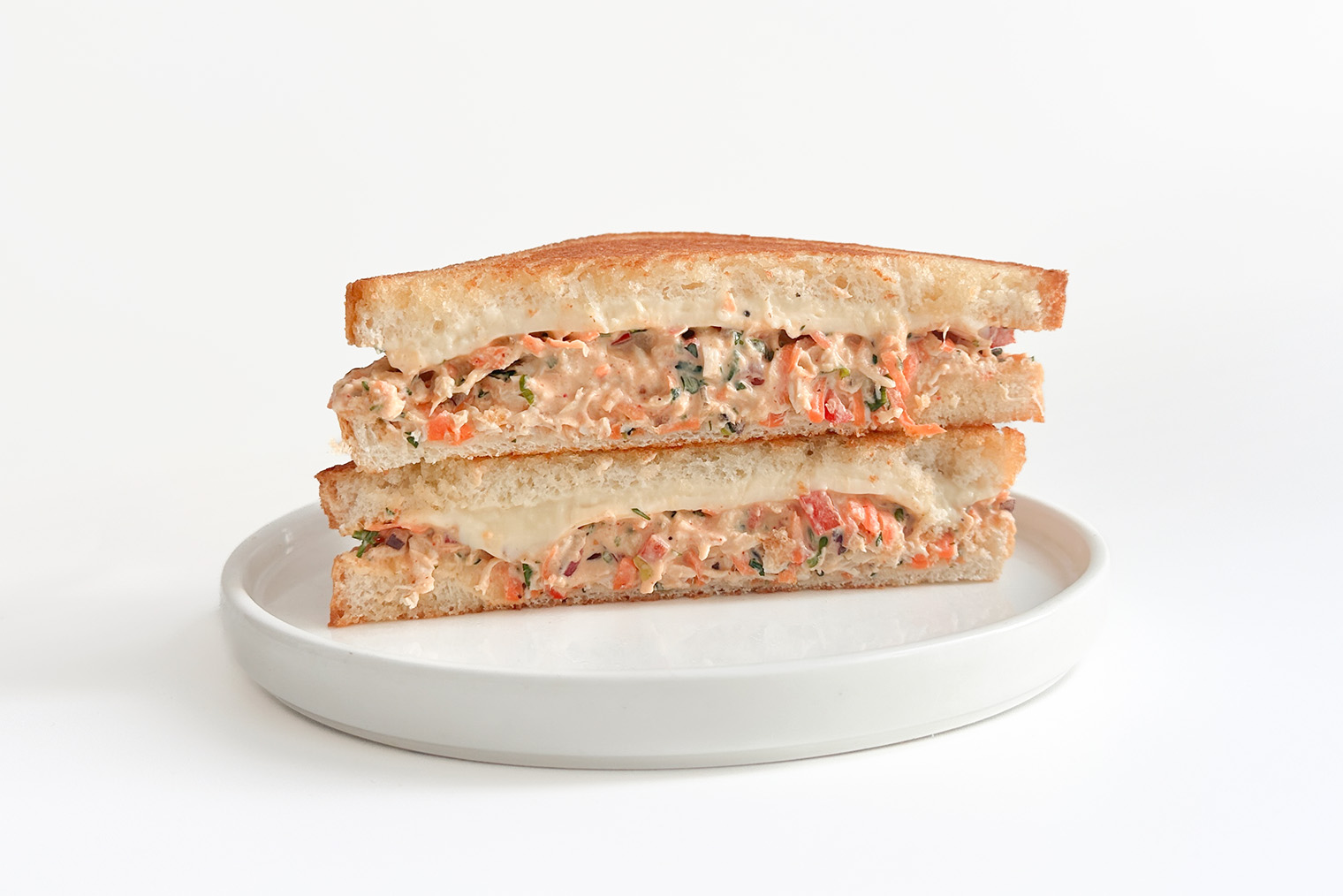 Шаг 4. На один ломтик хлеба выложите два ломтика плавленого сыра, на другой — начинку. Соедините половинки сэндвича.