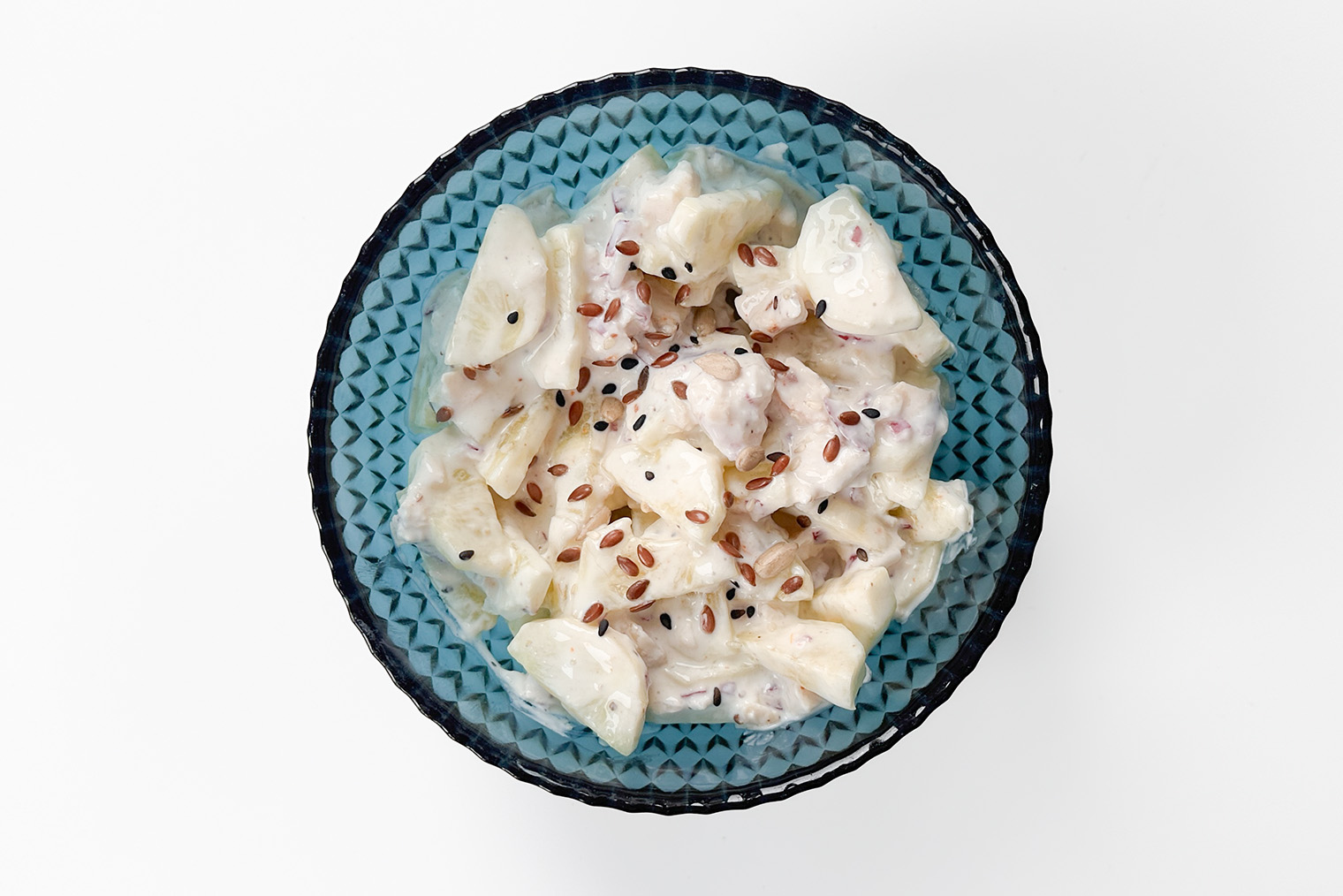 Шаг 1. Красный лук нарежьте мелко, огурец — полукружиями. Курицу нарежьте или разберите на небольшие кусочки. Чеснок пропустите через пресс или натрите на мелкой терке.