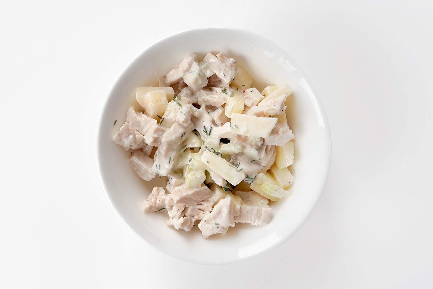 Шаг 3. Курицу, яблоко, сельдерей, укроп и зеленый лук выложите в тарелку. Добавьте заправку и перемешайте. Подавайте сразу.