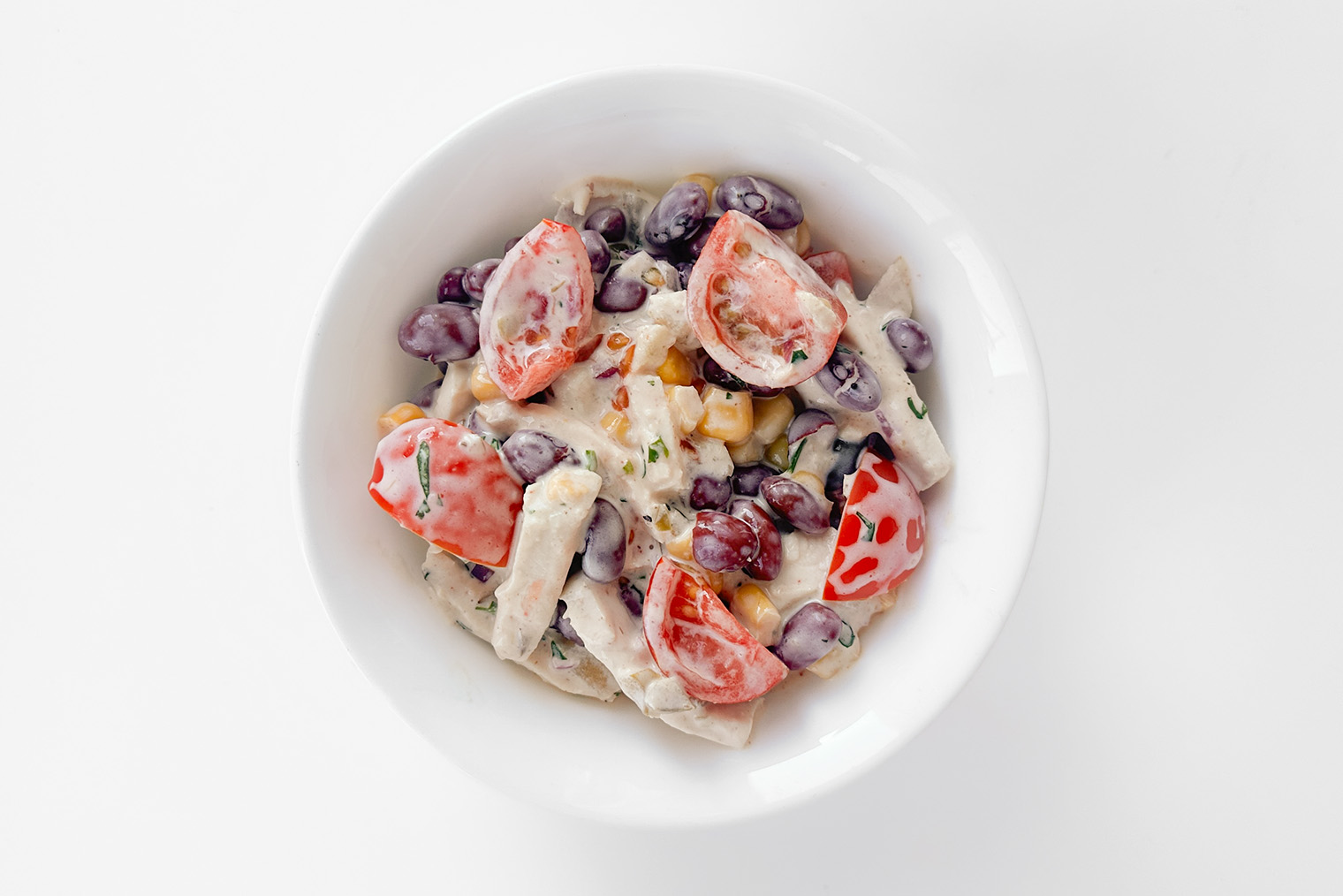 Шаг 3. Кукурузу, фасоль, курицу, черри, красный лук, халапеньо и кинзу переложите в глубокую тарелку. Добавьте заправку и перемешайте.