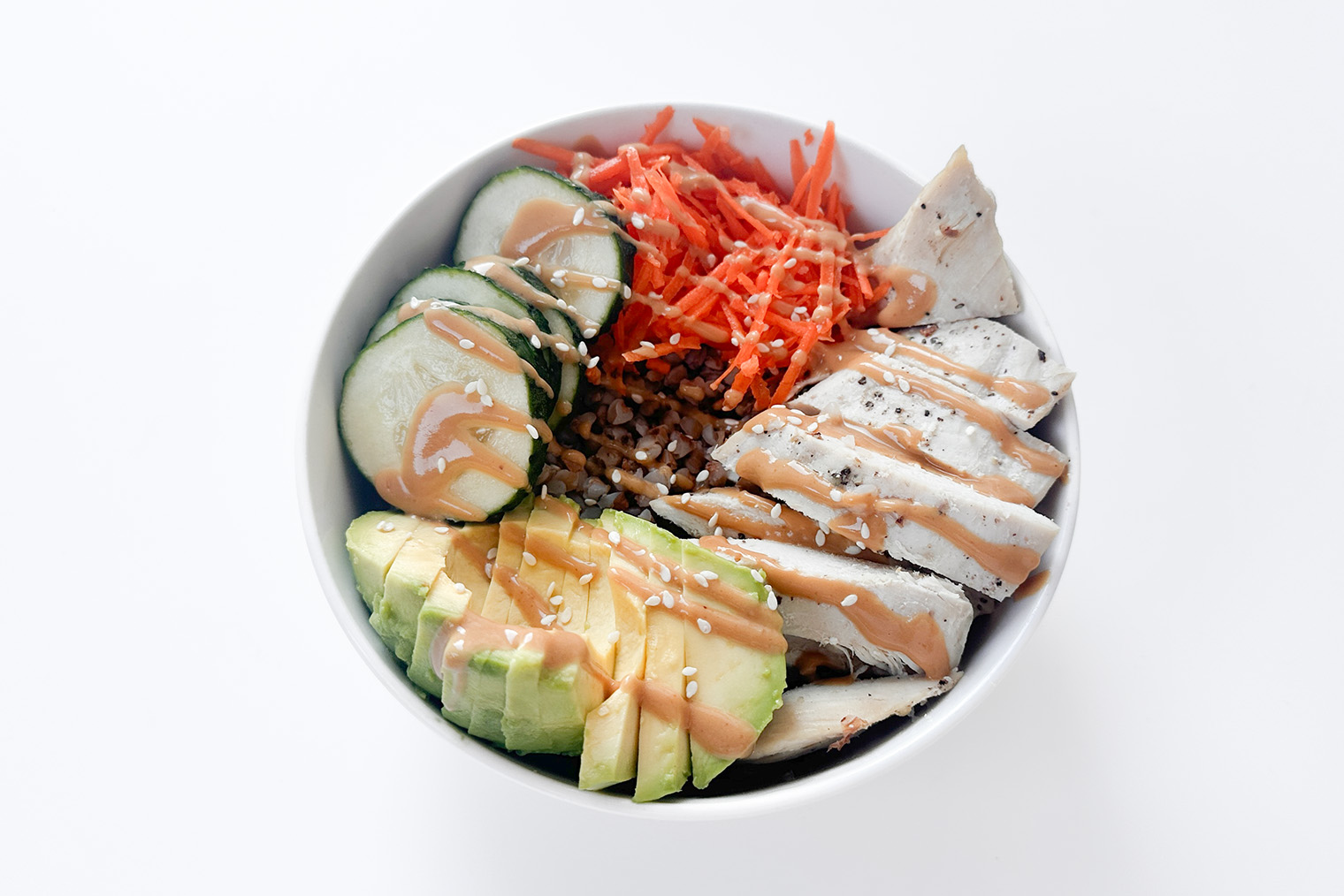 Шаг 4. Выложите в тарелку гречку, рядом — морковь, огурец и авокадо. Посыпьте кунжутом, полейте заправкой и подавайте.