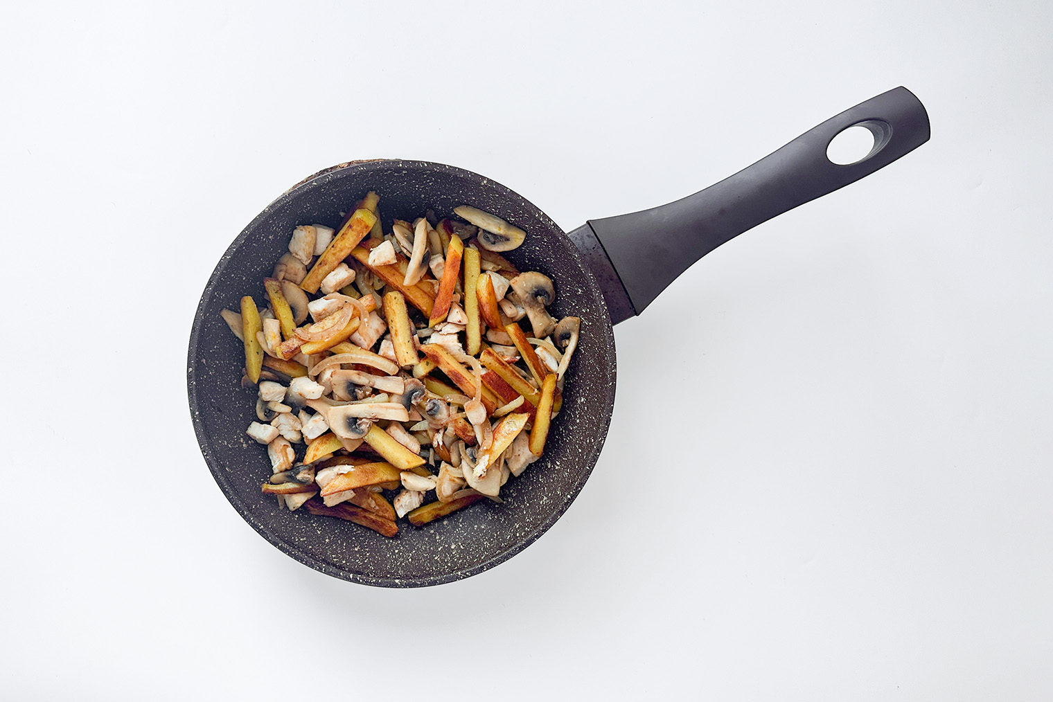 Шаг 1. Картошку нарежьте брусочками или тонкими ломтиками, лук — полукольцами или мелкими кубиками, шампиньоны — пластинками, курицу — небольшими кусочками.