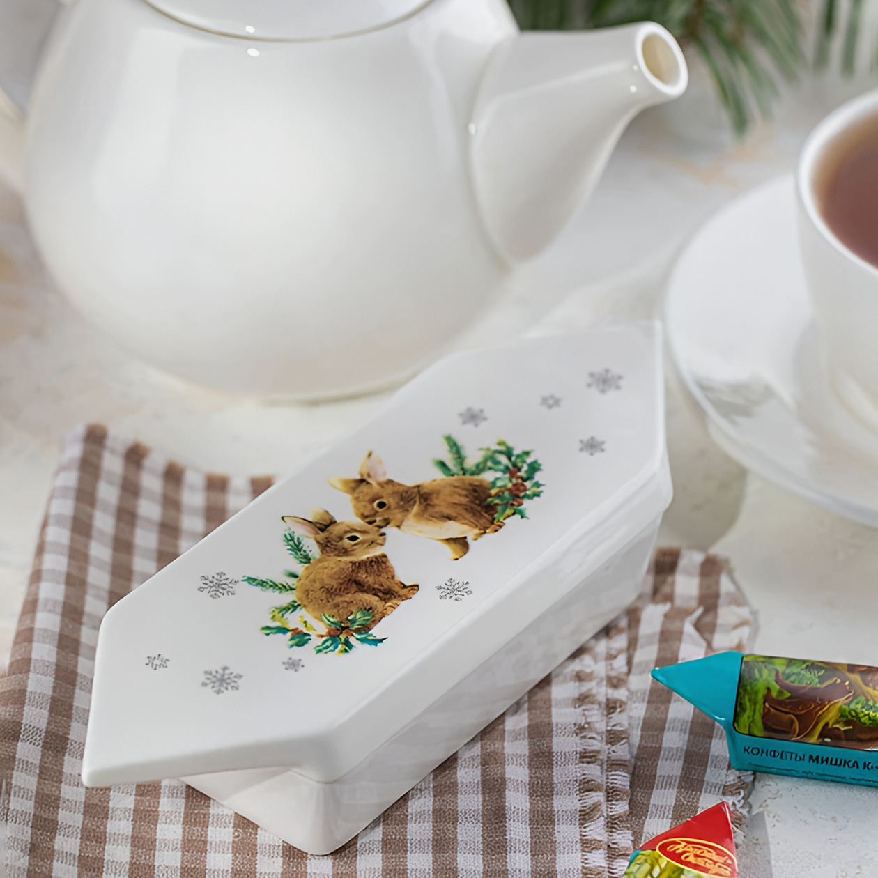 В ней все та же кухонная утварь с тематическими узорами, а еще елочные игрушки с советским флером. Есть стеклянные зайчики, шишки, снегири и Снегурочки, классические шары с фактурными узорами, стеклянные снежинки и другие знакомые с детства украшения. Если новогодний декор из масс-маркета кажется вам слишком современным и вы с восхищением вспоминаете, как бабушка наряжала елку, — «Дом фарфора» не разочарует.