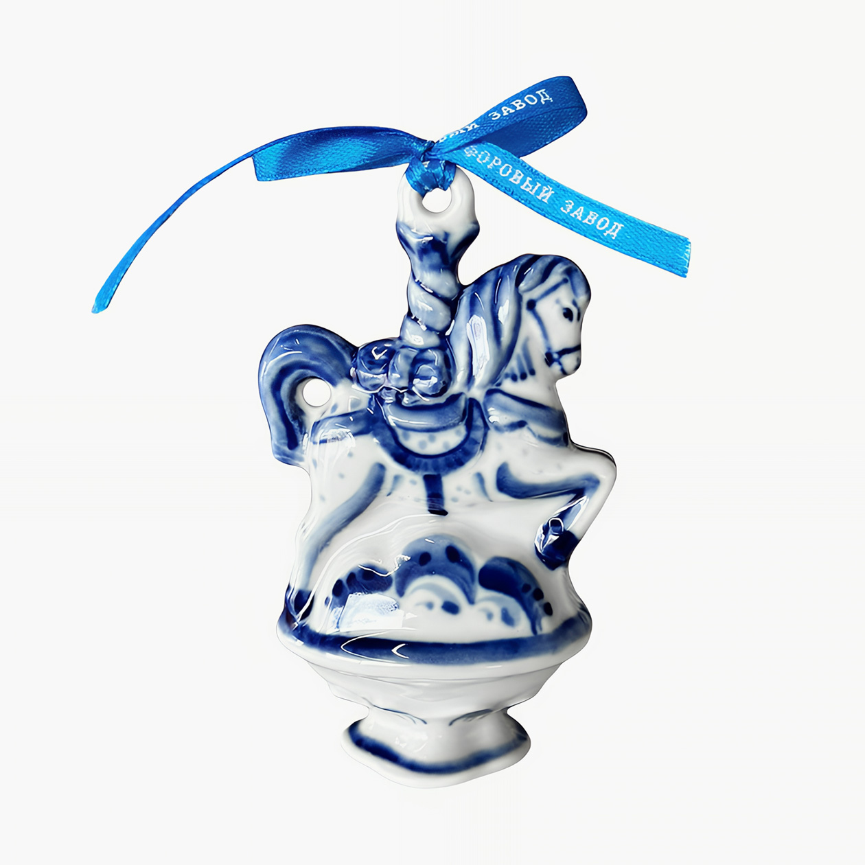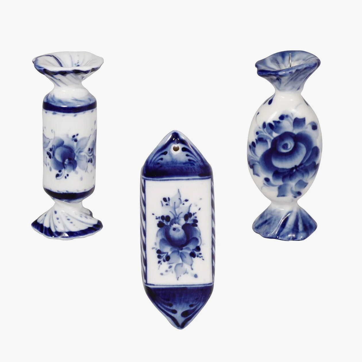 Кроме украшений из светлого фарфора есть более нарядная серия шаров, покрытых цветной глазурью. Самые впечатляющие выполнены в форме куполов храма Василия Блаженного — очень красиво и очень дорого.