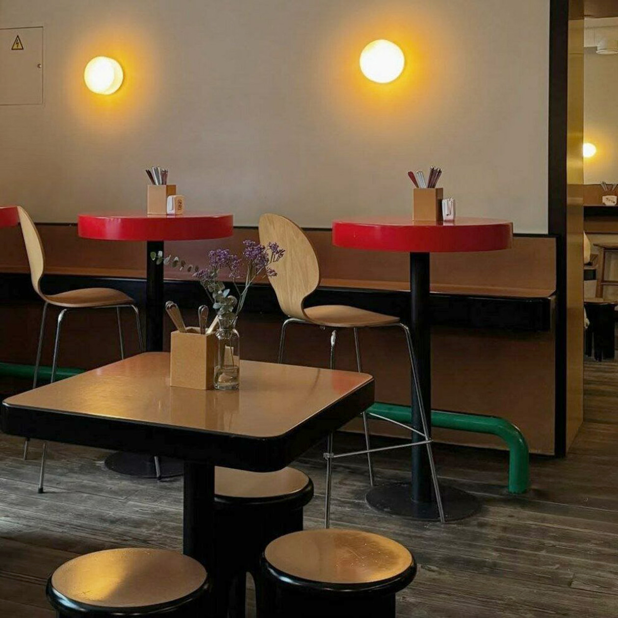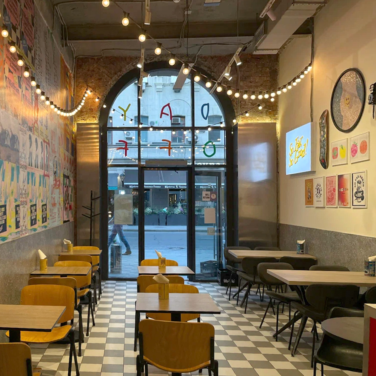Небольшая донерная со стойкой для заказов, открытой кухней и столиками вдоль стен. Интерьер — нарочито простой: постеры во всю стену, часы в виде кота Феликса, настенные арт-тарелки, пластиковые стулья и столовые приборы в банках из-под турецких солений на столах.