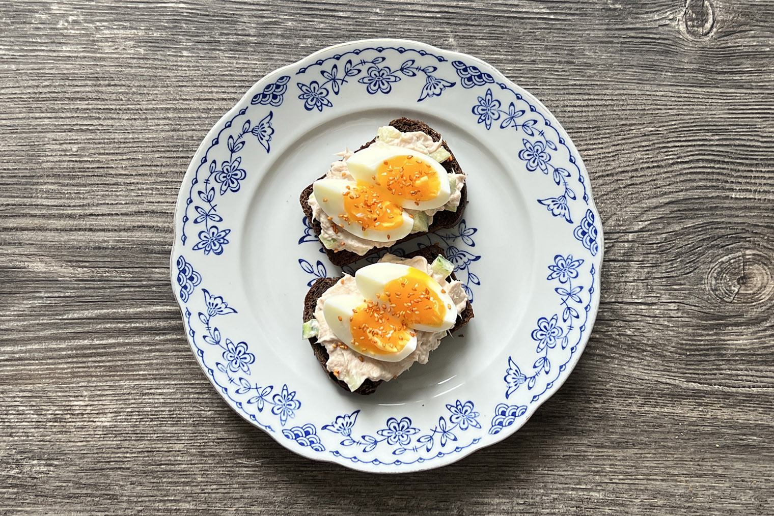 Сытный, а главное, быстрый белковый завтрак: рыбную намазку можно приготовить, пока варятся яйца. Хлеб подойдет любой, но мне больше всего нравится бородинский.