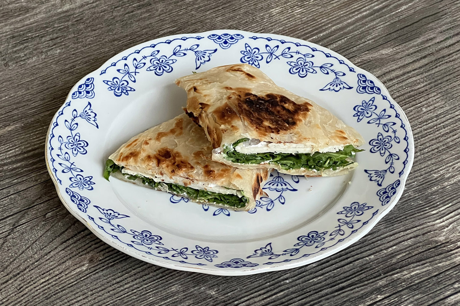 Шаг 3. Смажьте лепешку творожным сыром. Выложите на одну половину зелень и кусочки ветчины, а второй половиной накройте начинку. Разрежьте получившийся «сэндвич» пополам и подавайте.
