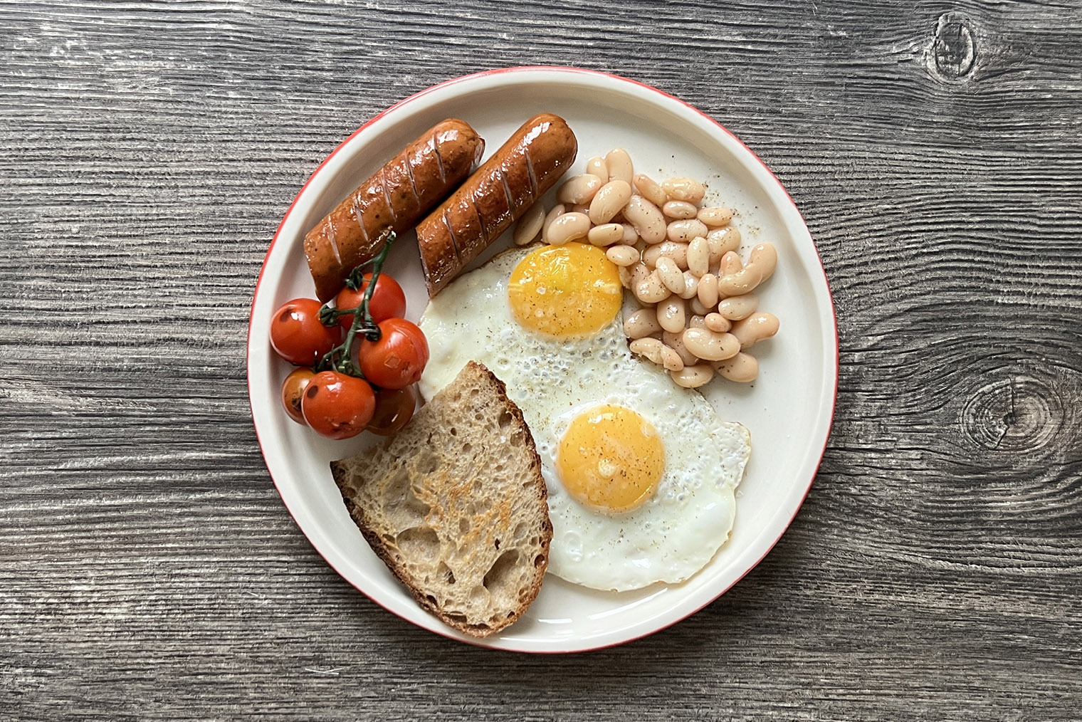 Шаг 4. Соберите завтрак на тарелке: яичница, сосиски, помидоры черри, ложка консервированной фасоли и ломтик хлеба. Его тоже можно немного поджарить — в тостере или на сковороде вместе с остальными ингредиентами.