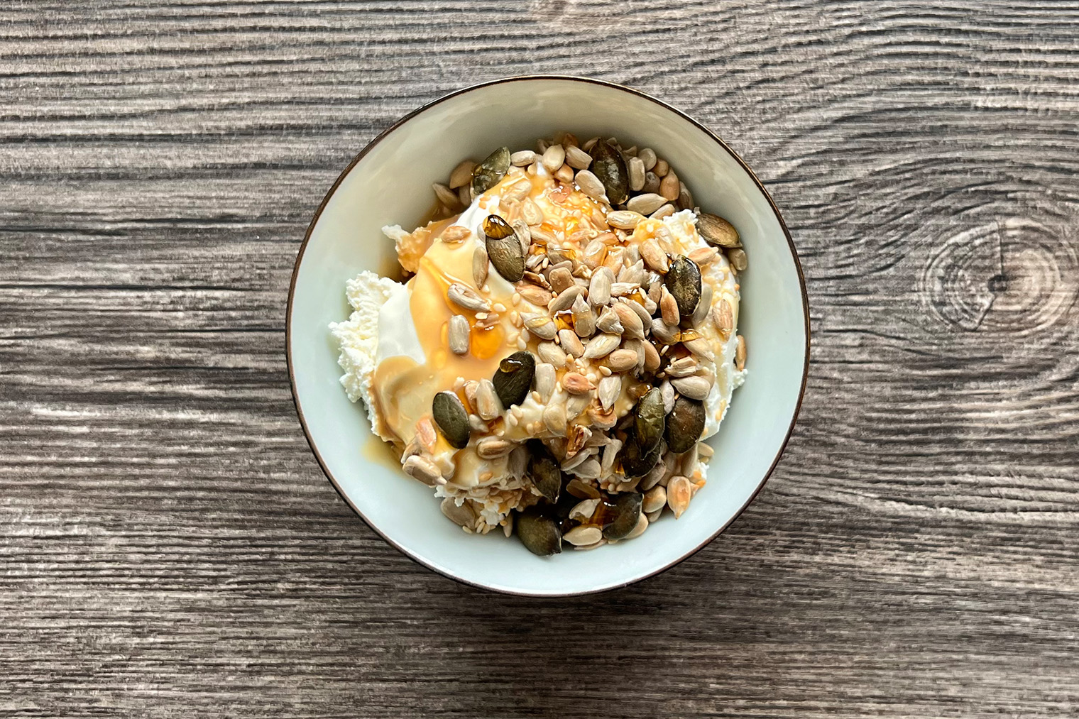 К творогу можно придумать множество дополнений. Моя любимая версия — со сметаной, кунжутной пастой тахини, медом и смесью разных семечек.