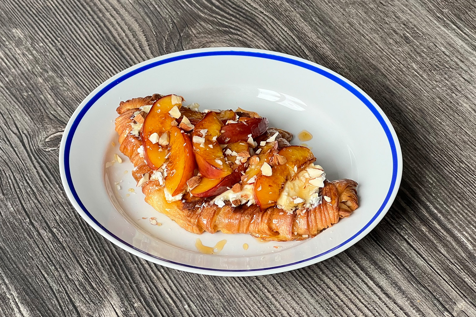 Шаг 5. Смажьте круассан творожным сыром, выложите сверху нектарины и полейте медом.
