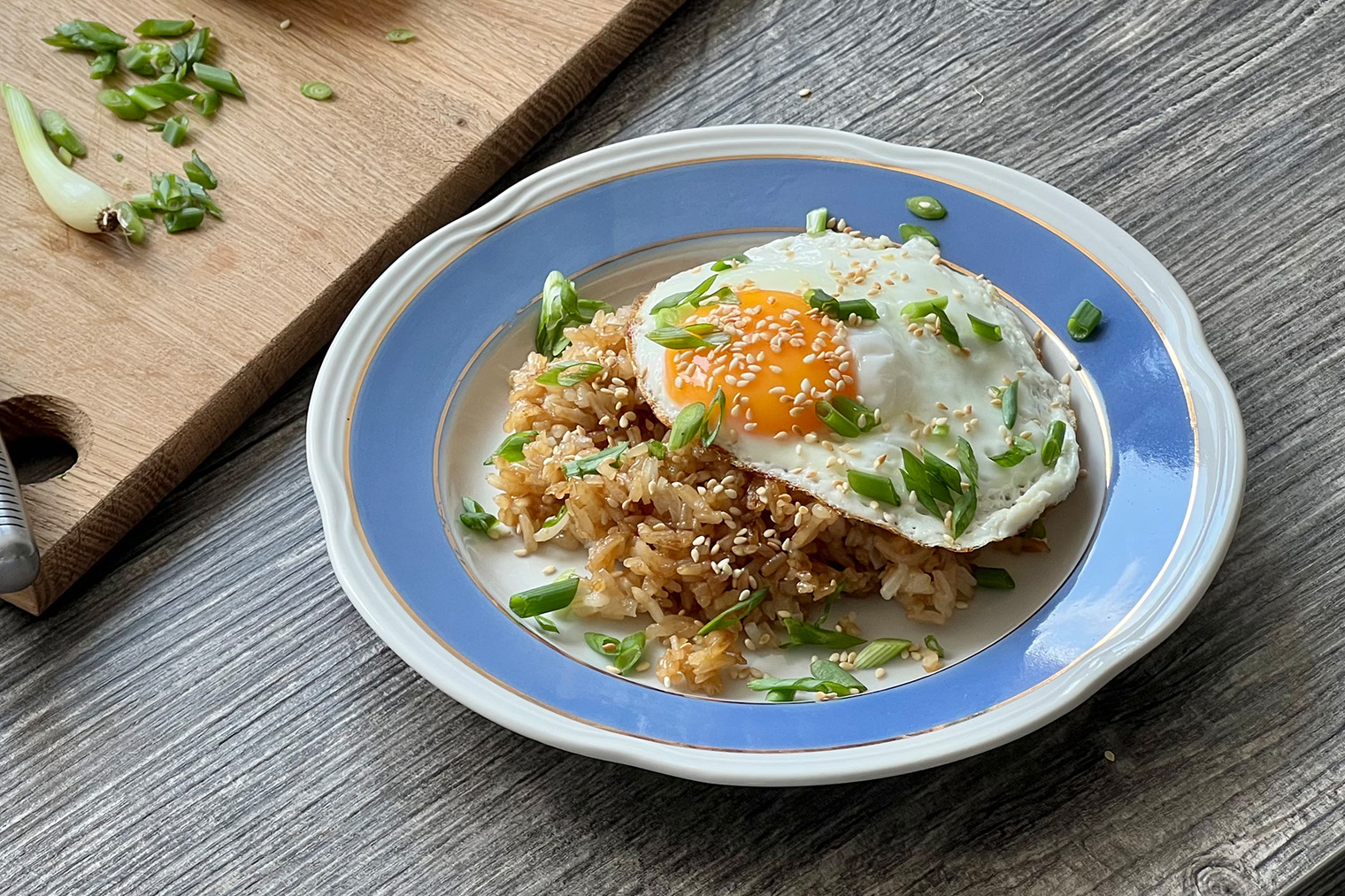 Шаг 3. Выложите рис в тарелку, сверху положите жареное яйцо, посыпьте зеленым луком и кунжутом. Попробуйте смешать жидкий желток с рисом — это очень вкусно. А еще блюдо идеально сочетается с острым соусом лао-ган-ма.