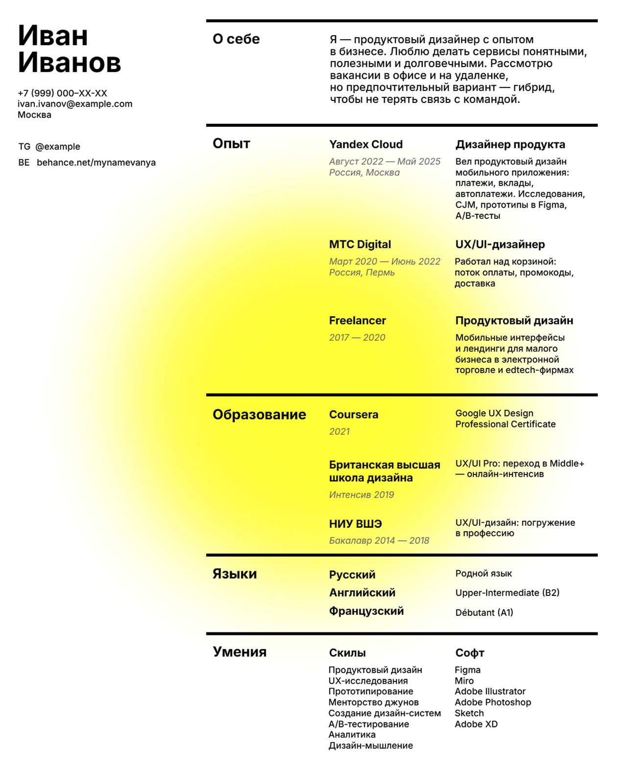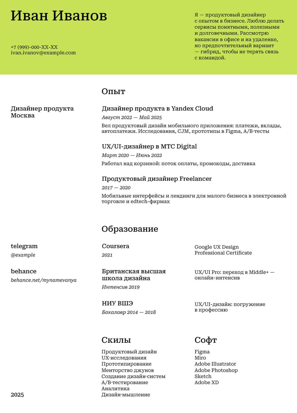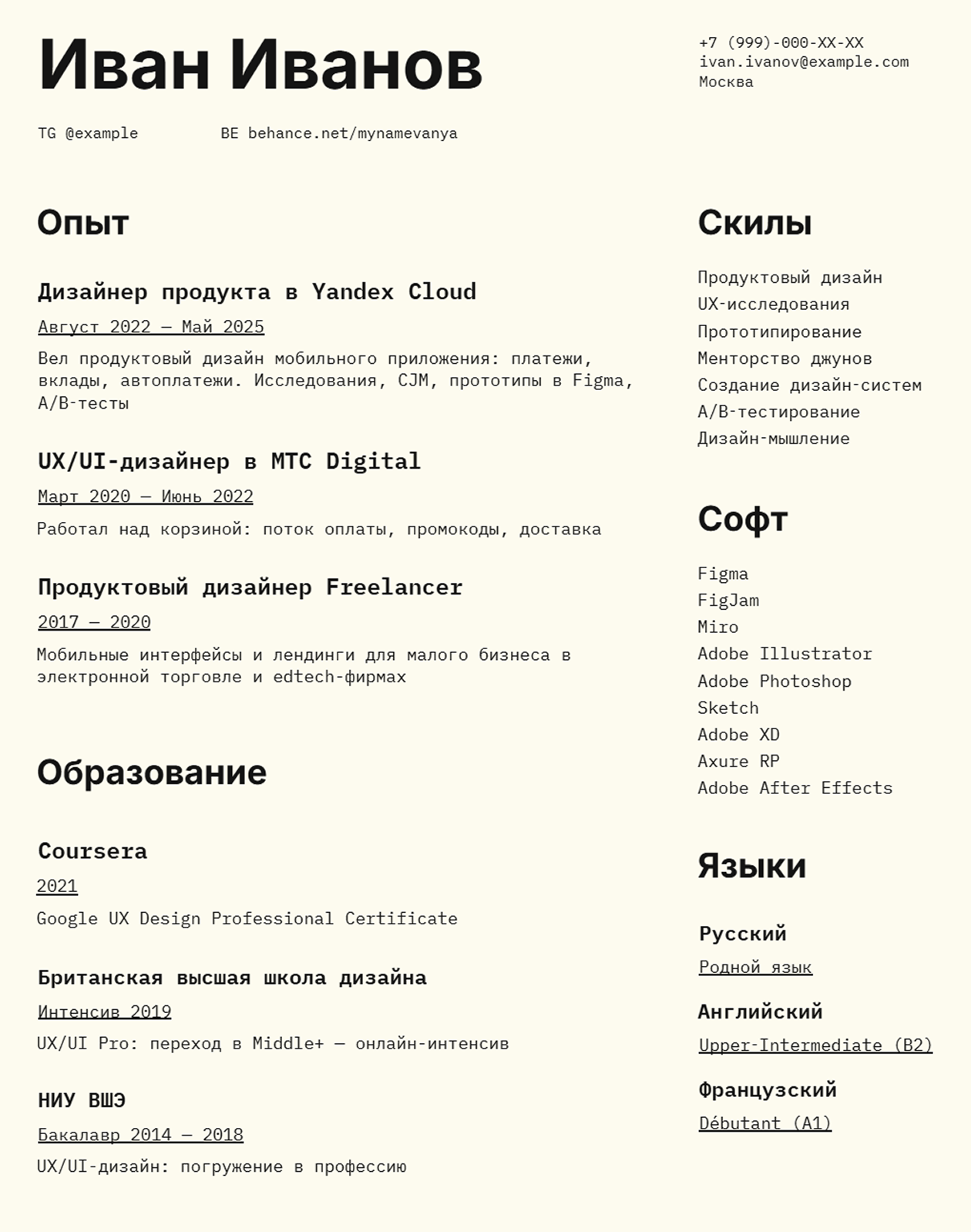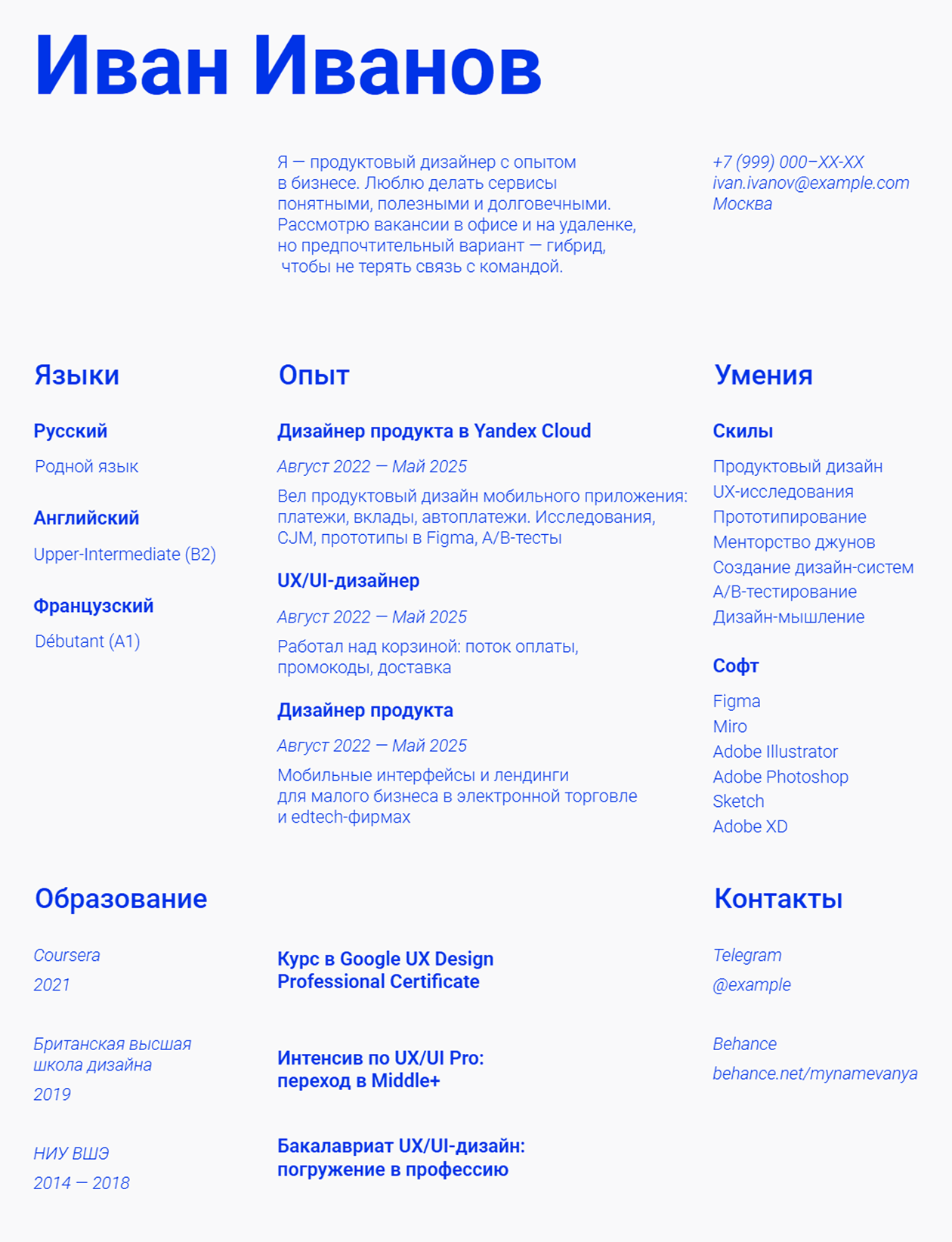 Чтобы не писать с нуля, проще воспользоваться шаблоном. Придумали пять версий — есть и простые, так и те, что позволят выделиться. Сделайте копию в Google Docs, заполните своими данными и скачайте в PDF.