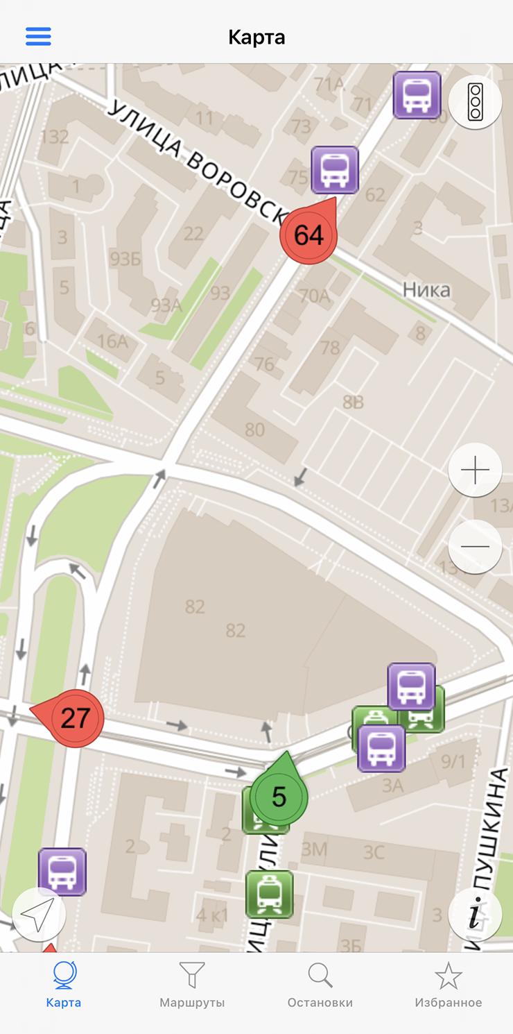 Как пользоваться. Движущийся транспорт отображается по умолчанию, как и велодорожки, самокаты, электрозарядные станции, каршеринг, а также участки, на которых перекрыто движение. Из-за этого карта выглядит загроможденной, а приложение тормозит. Если нужны только автобусы — можно отключить все ненужные слои с помощью кнопки в правом верхнем углу.