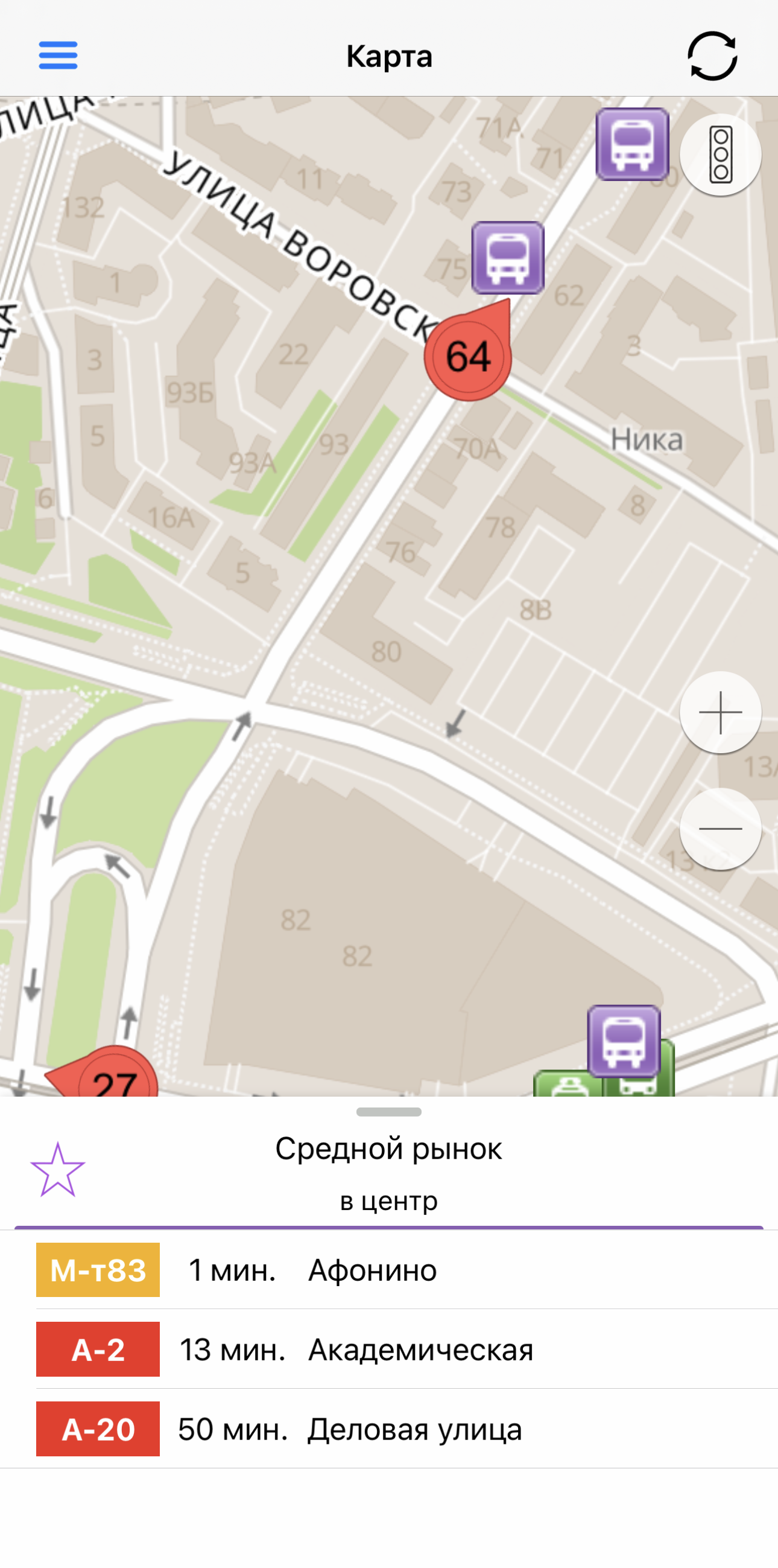 Как пользоваться. Приложение показывает карту с движущимся транспортом в реальном времени. Если выбрать конкретный автобус — покажет весь его маршрут, но без времени следования, если выбрать остановку — весь транспорт и время его прибытия.