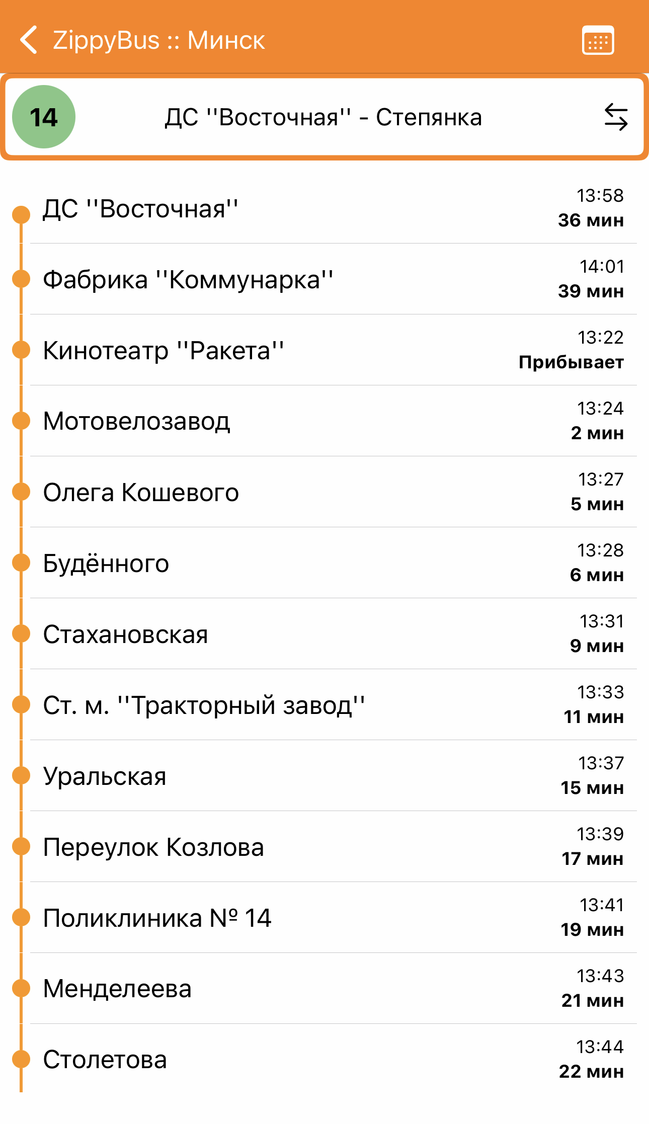 Например, если выберете остановку общественного транспорта в Беларуси — увидите, когда прибывают все маршруты и насколько они загружены. Если нажмете на конкретный автобус — появится его маршрут, все остановки и время прибытия.